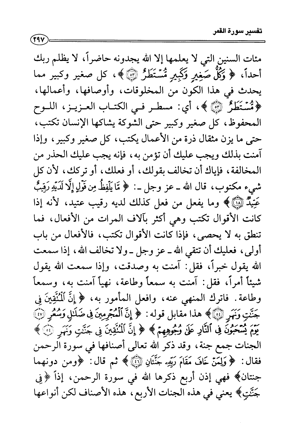 فاترك المنهي عنه، وافعل المأمور به، {إن المتقين في جنات ونهر} هذا مقابل قوله: {إن المجرمين في ضلال وسعر يوم يسحبون في النار على وجوههم} {إن المتقين في جنات ونهر} الجنات جمع جنة، وقد ذكر الله تعالى أصنافها في سورة الرحمن فقال: {ولمن خاف مقام ربه جنتان} ثم قال: {ومن دونهما جنتان} فهي إذن أربع ذكرها الله في سورة الرحمن، إذاً {في جنات} يعني في هذه الجنات الأربع، هذه الأصناف لكن أنواعها