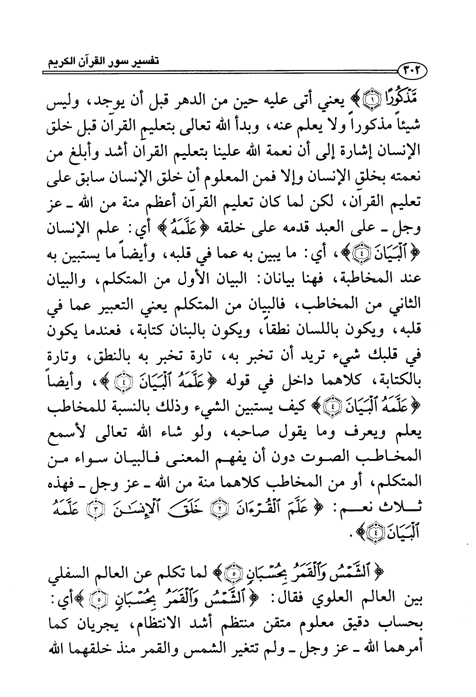 مذكوراً} يعني أتى عليه حين من الدهر قبل أن يوجد، وليس شيئاً مذكوراً ولا يعلم عنه، وبدأ الله تعالى بتعليم القرآن قبل خلق الإنسان إشارة إلى أن نعمة الله علينا بتعليم القرآن أشد وأبلغ من نعمته بخلق الإنسان وإلا فمن المعلوم أن خلق الإنسان سابق على تعليم القرآن، لكن لما كان تعليم القرآن أعظم منة من الله - عز وجل - على العبد قدمه على خلقه {علمه} أي: علم الإنسان {البيان} ، أي: ما يبين به عما في قلبه، وأيضاً ما يستبين به عند المخاطبة، فهنا بيانان: البيان الأول من المتكلم، والبيان الثاني من المخاطب، فالبيان من المتكلم يعني التعبير عما في قلبه، ويكون باللسان نطقاً، ويكون بالبنان كتابة، فعندما يكون في قلبك شيء تريد أن تخبر به، تارة تخبر به بالنطق، وتارة بالكتابة، كلاهما داخل في قوله {علمه البيان} ، وأيضاً {علمه البيان} كيف يستبين الشيء وذلك بالنسبة للمخاطب