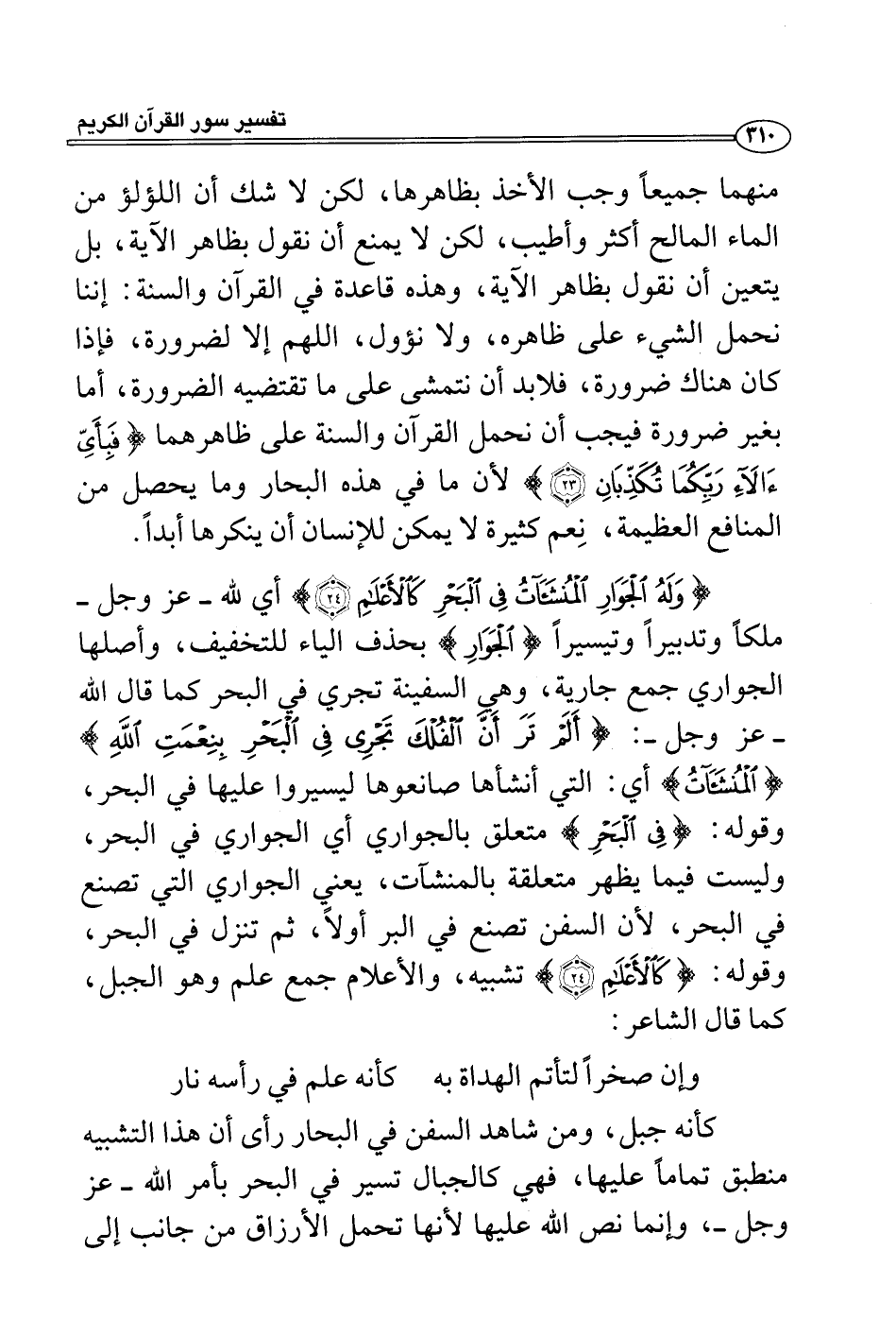 كأنه جبل، ومن شاهد السفن في البحار رأى أن هذا التشبيه منطبق تماماً عليها، فهي كالجبال تسير في البحر بأمر الله - عز وجل -، وإنما نص الله عليها لأنها تحمل الأرزاق من جانب إلى