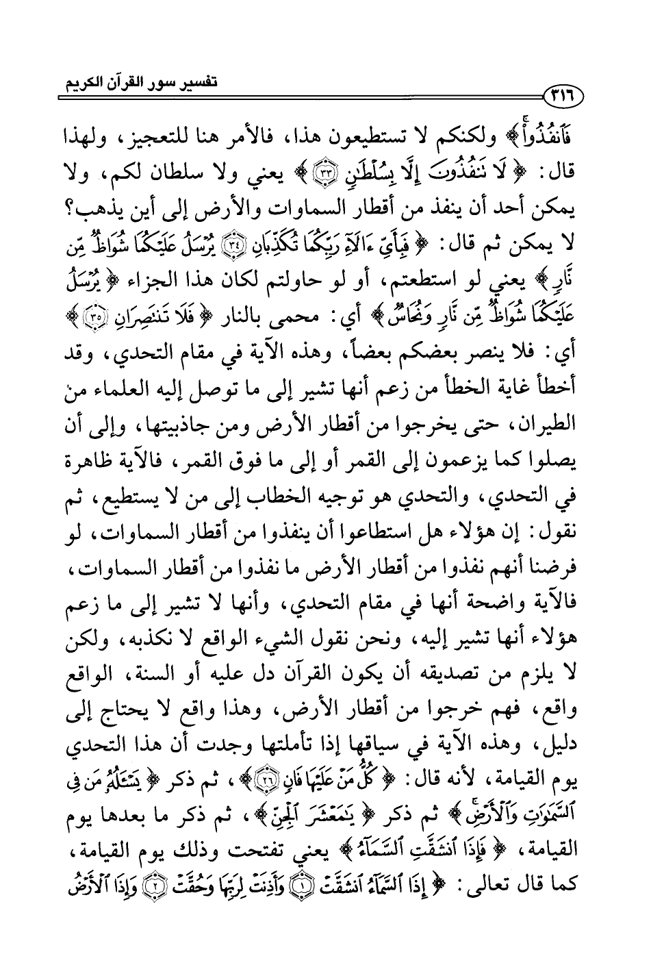 فانفذوا} ولكنكم لا تستطيعون هذا، فالأمر هنا للتعجيز، ولهذا قال: {لا تنفذون إلا بسلطان} يعني ولا سلطان لكم، ولا يمكن أحد أن ينفذ من أقطار السماوات والأرض إلى أين يذهب؟ لا يمكن ثم قال: {فبأي ءالآء ربكما تكذبان يرسل عليكما شواظ من نار} يعني لو استطعتم، أو لو حاولتم لكان هذا الجزاء {يرسل عليكما شواظ من نار ونحاس} أي: محمى بالنار {فلا تنتصران} أي: فلا ينصر بعضكم بعضاً، وهذه الآية في مقام التحدي، وقد أخطأ غاية الخطأ من زعم أنها تشير إلى ما توصل إليه العلماء من الطيران، حتى يخرجوا من أقطار الأرض ومن جاذبيتها، وإلى أن يصلوا كما يزعمون إلى القمر أو إلى ما فوق القمر، فالآية ظاهرة في التحدي، والتحدي هو توجيه الخطاب إلى من لا يستطيع، ثم نقول: إن هؤلاء هل استطاعوا أن ينفذوا من أقطار السماوات، لو فرضنا أنهم نفذوا من أقطار الأرض ما نفذوا من أقطار السماوات، فالآية واضحة أنها في مقام التحدي، وأنها لا تشير إلى ما زعم هؤلاء أنها تشير إليه، ونحن نقول الشيء الواقع لا نكذبه، ولكن لا يلزم من تصديقه أن يكون القرآن دل عليه أو السنة، الواقع واقع، فهم خرجوا من أقطار الأرض، وهذا واقع لا يحتاج إلى دليل، وهذه الآية في سياقها