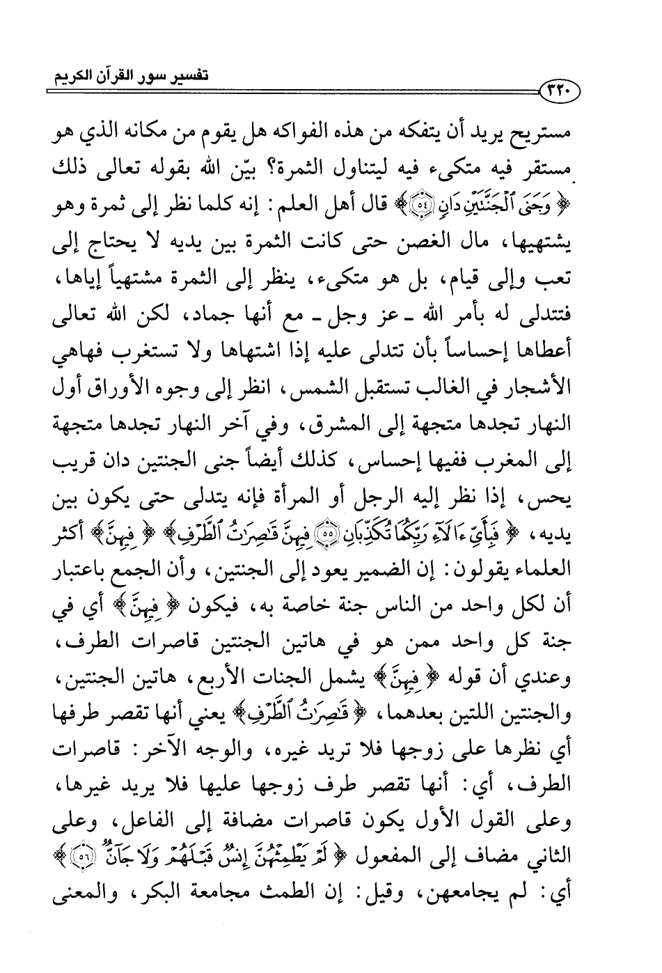 مستريح يريد أن يتفكه من هذه الفواكه هل يقوم من مكانه الذي هو مستقر فيه متكىء فيه ليتناول الثمرة؟ بيّن الله بقوله تعالى ذلك {وجنى الجنتين دان} قال أهل العلم: إنه كلما نظر إلى ثمرة وهو يشتهيها، مال الغصن حتى كانت الثمرة بين يديه لا يحتاج إلى تعب وإلى قيام، بل هو متكىء، ينظر إلى الثمرة مشتهياً إياها، فتتدلى له بأمر الله - عز وجل - مع أنها جماد، لكن الله تعالى أعطاها إحساساً بأن تتدلى عليه إذا اشتهاها ولا تستغرب فهاهي الأشجار في الغالب تستقبل الشمس، انظر إلى وجوه الأوراق أول النهار تجدها متجهة إلى المشرق، وفي آخر النهار تجدها متجهة إلى المغرب ففيها إحساس، كذلك أيضاً جنى الجنتين دان قريب يحس، إذا نظر إليه الرجل أو المرأة فإنه يتدلى حتى يكون بين يديه، {فبأي ءالآء ربكما تكذبان فيهن قاصرات الطرف} {فيهن} أكثر العلماء يقولون: إن الضمير يعود إلى الجنتين، وأن الجمع باعتبار أن لكل واحد من الناس جنة خاصة به، فيكون {فيهن} أي في جنة كل واحد ممن هو في هاتين الجنتين قاصرات الطرف، وعندي أن قوله {فيهن} يشمل الجنات الأربع، هاتين الجنتين، والجنتين اللتين بعدهما، {قاصرات الطرف} يعني أنها تقصر طرفها أي نظرها على زوجها فلا تريد غيره، والوجه الآخر: قاصرات الطرف، أي: أنها تقصر طرف زوجها عليها فلا يريد غيرها، وعلى القول الأول يكون قاصرات مضافة إلى الفاعل، وعلى الثاني مضاف إلى المفعول {لم يطمثهن إنس قبلهم ولا جآن} أي: لم يجامعهن، وقيل: إن الطمث مجامعة البكر، والمعنى