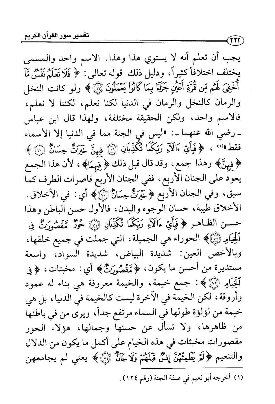 الاسم واحد والمسمى يختلف اختلافاً كثيراً، ودليل ذلك قوله تعالى: {فلا تعلم نفس مآ أخفي لهم من قرة أعين جزاءً بما كانوا يعملون} ولو كانت النخل والرمان كالنخل والرمان في الدنيا لكنا نعلم، لكننا لا نعلم، فالاسم واحد، ولكن الحقيقة مختلفة، ولهذا قال ابن عباس - رضي الله عنهما -: «ليس في الجنة مما في الدنيا إلا الأسماء فقط» (¬1) ، {فبأي ءالآء ربكما تكذبان فيهن خيرات حسان} {فيهن} وهذا جمع، وقد قال قبل ذلك {فيهما} ، لأن هذا الجمع يعود على الجنان الأربع، ففي الجنان الأربع قاصرات الطرف كما سبق، وفي الجنان الأربع {خيرات حسان} أي: في الأخلاق.