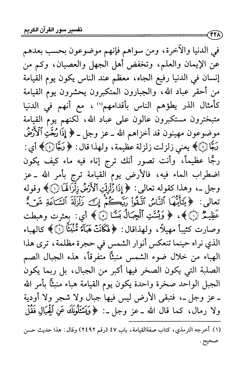 مع أنهم في الدنيا متبخترون مستكبرون عالون على عباد الله، لكنهم يوم القيامة موضوعون مهينون قد أخزاهم الله - عز وجل - {إذا رجت الأَرض رجاً} يعني زلزلت زلزلة عظيمة، ولهذا قال: {رجاً} أي: رجًّا عظيماً، وأنت تصور أنك ترج إناء فيه ماء كيف يكون اضطراب الماء فيه، فالأرض يوم القيامة ترج بأمر الله - عز وجل -، وهذا كقوله تعالى: {إذا زلزلت الأَرض زلزالها} وقوله تعالى: {يا أيها الناس اتقوا ربكم إن زلزلة الساعة شيء عظيم} ، {وبست الجبال بساً} أي: بعثرت وهبطت وصارت كثيباً مهيلاً، ولهذاقال: {فكانت هباءً منبثاً} كالهباء الذي نراه حينما تنعكس أنوار الشمس في حجرة مظلمة، ترى هذا الهباء من خلال ضوء الشمس منبثًّا متفرقاً، هذه الجبال الصم الصلبة التي يكون الصخر فيها أكبر من الجبال، بل ربما يكون الجبل الواحد صخرة واحدة يكون يوم القيامة هباء منبثًّا بأمر الله - عز وجل -، فتبقى الأرض ليس فيها جبال ولا شجر ولا أودية ولا رمال، كما قال الله - عز وجل -: {ويسئلونك عن الجبال فقل