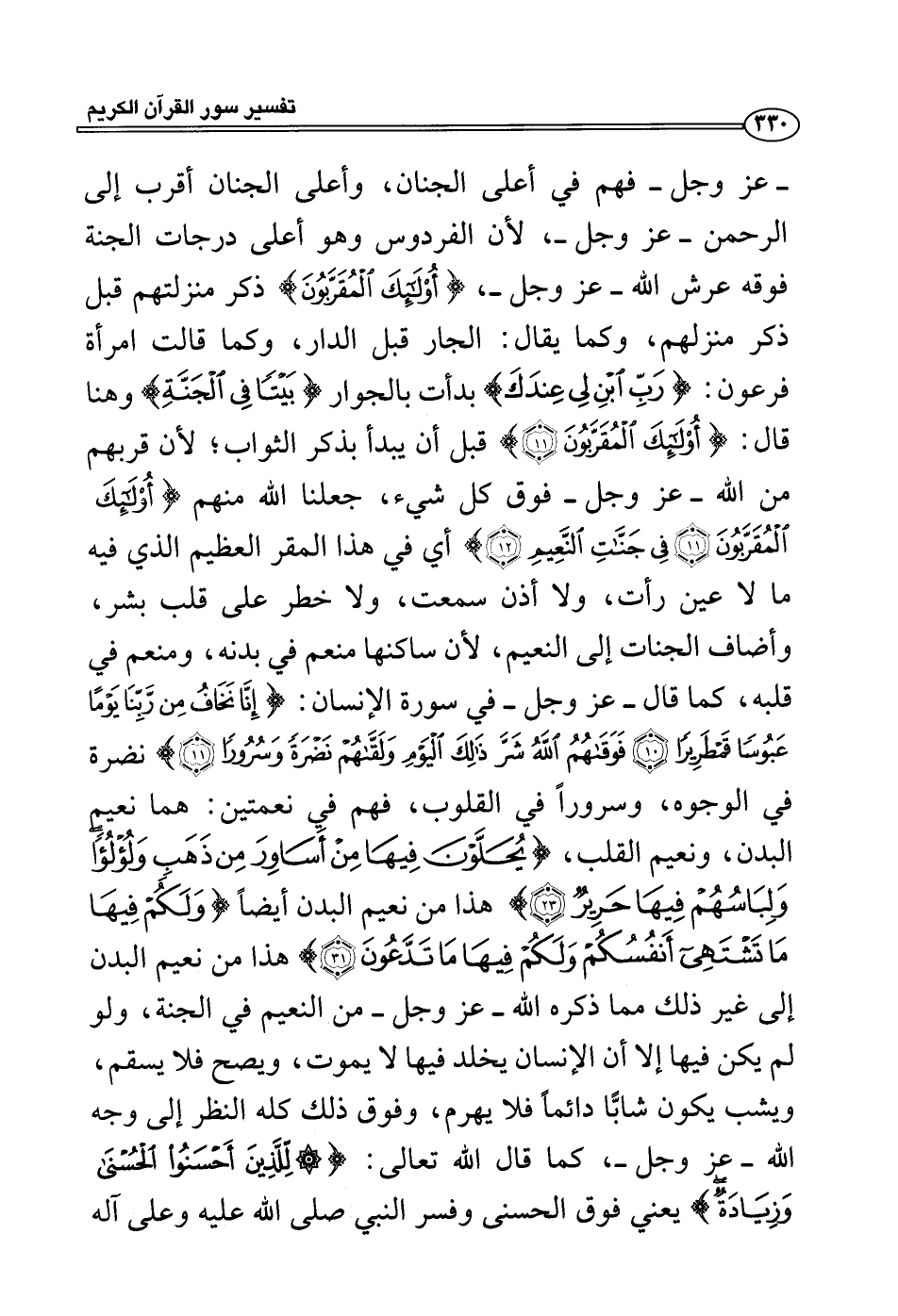 - عز وجل - فهم في أعلى الجنان، وأعلى الجنان أقرب إلى الرحمن - عز وجل -، لأن الفردوس وهو أعلى درجات الجنة فوقه عرش الله - عز وجل -، {أولئك المقربون} ذكر منزلتهم قبل ذكر منزلهم، وكما يقال: الجار قبل الدار، وكما قالت امرأة فرعون: {رب ابن لى عندك} بدأت بالجوار {بيتاً في الجنة} وهنا قال: {أولئك المقربون} قبل أن يبدأ بذكر الثواب؛ لأن قربهم من الله - عز وجل - فوق كل شيء، جعلنا الله منهم {أولئك المقربون في جنات النعيم} أي في هذا المقر العظيم الذي فيه ما لا عين رأت، ولا أذن سمعت، ولا خطر على قلب بشر، وأضاف الجنات إلى النعيم، لأن ساكنها منعم في بدنه، ومنعم في قلبه، كما قال - عز وجل - في سورة الإنسان: {إنا نخاف من ربنا يوماً عبوساً قمطريراً فوقاهم الله شر ذلك اليوم ولقاهم نضرةً وسروراً} نضرة في الوجوه، وسروراً في القلوب، فهم في نعمتين: هما نعيم البدن، ونعيم القلب، {يحلون فيها من أساور من ذهب ولؤلؤاً ولباسهم فيها حرير} هذا من نعيم البدن أيضاً {ولكم فيها ما تشتهي أنفسكم ولكم فيها ما تدعون} هذا من نعيم البدن إلى غير ذلك مما ذكره الله - عز وجل - من النعيم في الجنة، ولو لم يكن فيها إلا أن الإنسان يخلد فيها لا يموت، ويصح فلا يسقم، ويشب يكون شابًّا دائماً فلا يهرم، وفوق ذلك كله النظر إلى وجه الله - عز وجل -، كما قال الله تعالى: {للذين أحسنوا الحسنى وزيادة} يعني فوق الحسنى وفسر النبي صلى الله عليه وعلى آله