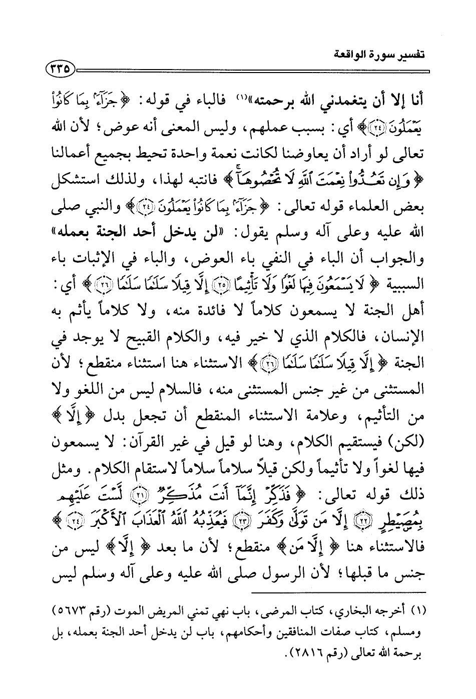 فالباء في قوله: {جزاءً بما كانوا يعملون} أي: بسبب عملهم، وليس المعنى أنه عوض؛ لأن الله تعالى لو أراد أن يعاوضنا لكانت نعمة واحدة تحيط بجميع أعمالنا {وإن تعدوا نعمة الله لا تحصوها} فانتبه لهذا، ولذلك استشكل بعض العلماء قوله تعالى: {جزاءً بما كانوا يعملون} والنبي صلى الله عليه وعلى آله وسلم يقول: «لن يدخل أحد الجنة بعمله» والجواب أن الباء في النفي باء العوض، والباء في الإثبات باء السببية {لا يسمعون فيها لغواً ولا تأثيماً إلا قيلاً سلاما سلاما} أي: أهل الجنة لا يسمعون كلاماً لا فائدة منه، ولا كلاماً يأثم به الإنسان، فالكلام الذي لا خير فيه، والكلام القبيح لا يوجد في الجنة {إلا قيلاً سلاما سلاما} الاستثناء هنا استثناء منقطع؛ لأن المستثنى من غير جنس المستثنى منه، فالسلام ليس من اللغو ولا من التأثيم، وعلامة الاستثناء المنقطع أن تجعل بدل {إلا} (لكن) فيستقيم الكلام، وهنا لو قيل في غير القرآن: لا يسمعون فيها لغواً ولا تأثيماً ولكن قيلاً سلاماً سلاماً لاستقام الكلام. ومثل ذلك قوله تعالى: {فذكر إنمآ أنت مذكر لست عليهم بمسيطر إلا من تولى وكفر فيعذبه الله العذاب الأَكبر} فالاستثناء هنا {إلا من} منقطع؛ لأن ما بعد {إلا} ليس من جنس ما قبلها؛ لأن الرسول صلى الله عليه وعلى آله وسلم ليس