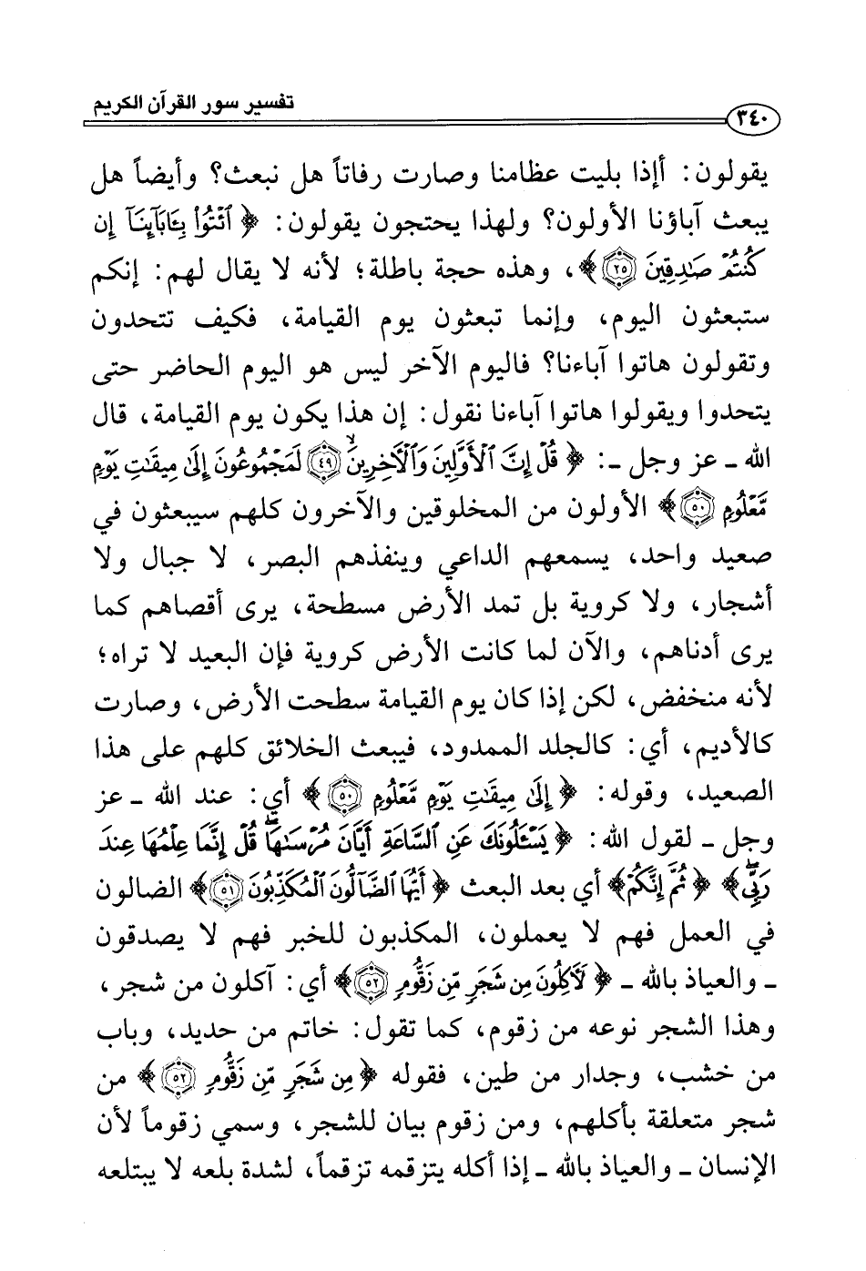 يقولون: أإذا بليت عظامنا وصارت رفاتاً هل نبعث؟ وأيضاً هل يبعث آباؤنا الأولون؟ ولهذا يحتجون يقولون: {ائتوا بآبائنا إن كنتم صادقين} ، وهذه حجة باطلة؛ لأنه لا يقال لهم: إنكم ستبعثون اليوم، وإنما تبعثون يوم القيامة، فكيف تتحدون وتقولون هاتوا آباءنا؟ فاليوم الآخر ليس هو اليوم الحاضر حتى يتحدوا ويقولوا هاتوا آباءنا نقول: إن هذا يكون يوم القيامة، قال الله - عز وجل -: {قل إن الأَولين والأَخرين لمجموعون إلى ميقات يوم معلوم} الأولون من المخلوقين والآخرون كلهم سيبعثون في صعيد واحد، يسمعهم الداعي وينفذهم البصر، لا جبال ولا أشجار، ولا كروية بل تمد الأرض مسطحة، يرى أقصاهم كما يرى أدناهم، والآن لما كانت الأرض كروية فإن البعيد لا تراه؛ لأنه منخفض، لكن إذا كان يوم القيامة سطحت الأرض، وصارت كالأديم، أي: كالجلد الممدود، فيبعث الخلائق كلهم على هذا الصعيد، وقوله: {إلى ميقات يوم معلوم} أي: عند الله - عز وجل - لقول الله: {يسئلونك عن الساعة أيان مرساها قل إنما علمها عند ربي} {ثم إنكم} أي بعد البعث {أيها الضآلون المكذبون} الضالون في العمل فهم لا يعملون، المكذبون للخبر فهم لا يصدقون - والعياذ بالله - {لأَكلون من شجر من زقوم} أي: آكلون من شجر، وهذا الشجر نوعه من زقوم، كما تقول: خاتم من حديد، وباب من خشب، وجدار من طين، فقوله {من شجر من زقوم} من شجر متعلقة بأكلهم، ومن زقوم بيان للشجر، وسمي زقوماً لأن الإنسان - والعياذ