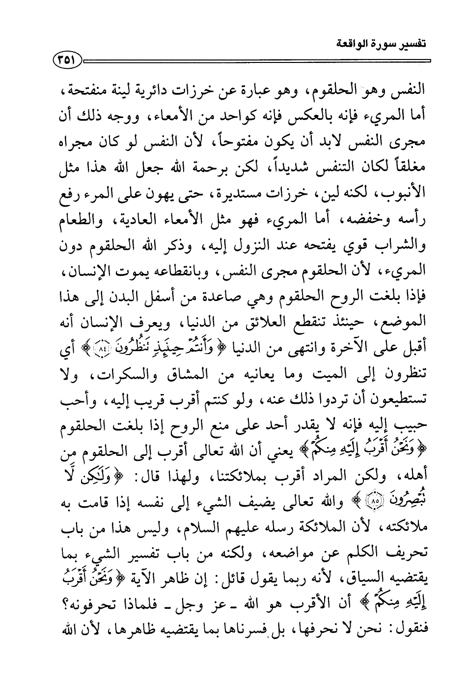 النفس وهو الحلقوم، وهو عبارة عن خرزات دائرية لينة منفتحة، أما المريء فإنه بالعكس فإنه كواحد من الأمعاء، ووجه ذلك أن مجرى النفس لابد أن يكون مفتوحاً، لأن النفس لو كان مجراه مغلقاً لكان التنفس شديداً، لكن برحمة الله جعل الله هذا مثل الأنبوب، لكنه لين، خرزات مستديرة، حتى يهون على المرء رفع رأسه وخفضه، أما المريء فهو مثل الأمعاء العادية، والطعام والشراب قوي يفتحه عند النزول إليه، وذكر الله الحلقوم دون المريء، لأن الحلقوم مجرى النفس، وبانقطاعه يموت الإنسان، فإذا بلغت الروح الحلقوم وهي صاعدة من أسفل البدن إلى هذا الموضع، حينئذ تنقطع العلائق من الدنيا، ويعرف الإنسان أنه أقبل على الآخرة وانتهى من الدنيا {وأنتم حينئذ تنظرون} أي تنظرون إلى الميت وما يعانيه من المشاق والسكرات، ولا تستطيعون أن تردوا ذلك عنه، ولو كنتم أقرب قريب إليه، وأحب حبيب إليه فإنه لا يقدر أحد على منع الروح إذا بلغت الحلقوم {ونحن أقرب إليه منكم} يعني أن الله تعالى أقرب إلى الحلقوم من أهله، ولكن المراد أقرب بملائكتنا، ولهذا قال: {ولكن لا تبصرون} والله تعالى يضيف الشيء إلى نفسه إذا قامت به ملائكته، لأن الملائكة رسله عليهم السلام، وليس هذا من باب تحريف الكلم عن مواضعه، ولكنه من باب تفسير الشيء بما يقتضيه السياق، لأنه ربما يقول قائل: إن ظاهر الآية