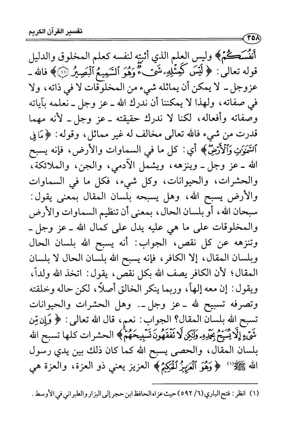 وجل - لأنه مهما قدرت من شيء فالله تعالى مخالف له غير مماثل، وقوله: {ما في السماوات والأَرض} أي: كل ما في السماوات والأرض، فإنه يسبح الله - عز وجل - وينزهه، ويشمل الآدمي، والجن، والملائكة، والحشرات، والحيوانات، وكل شيء، فكل ما في السماوات والأرض يسبح الله، وهل يسبحه بلسان المقال بمعنى يقول: سبحان الله، أو بلسان الحال، بمعنى أن تنظيم السماوات والأرض والمخلوقات على ما هي عليه يدل على كمال الله - عز وجل - وتنزهه عن كل نقص، الجواب: أنه يسبح الله بلسان الحال وبلسان المقال، إلا الكافر، فإنه يسبح الله بلسان الحال لا بلسان المقال؛ لأن الكافر يصف الله بكل نقص، يقول: اتخذ الله ولداً، ويقول: إن معه إلهاً، وربما ينكر الخالق أصلاً، لكن حاله وخلقته وتصرفه تسبيح لله - عز وجل -. وهل الحشرات والحيوانات تسبح الله بلسان المقال؟ الجواب: نعم، قال الله تعالى: {وإن من شيء إلا يسبح بحمده ولكن لا تفقهون تسبيحهم} الحشرات كلها تسبح الله بلسان المقال، والحصى يسبح الله كما كان ذلك بين يدي رسول الله صلى الله عليه وسلم (¬1) {وهو العزيز الحكيم} العزيز يعني ذو العزة، والعزة هي