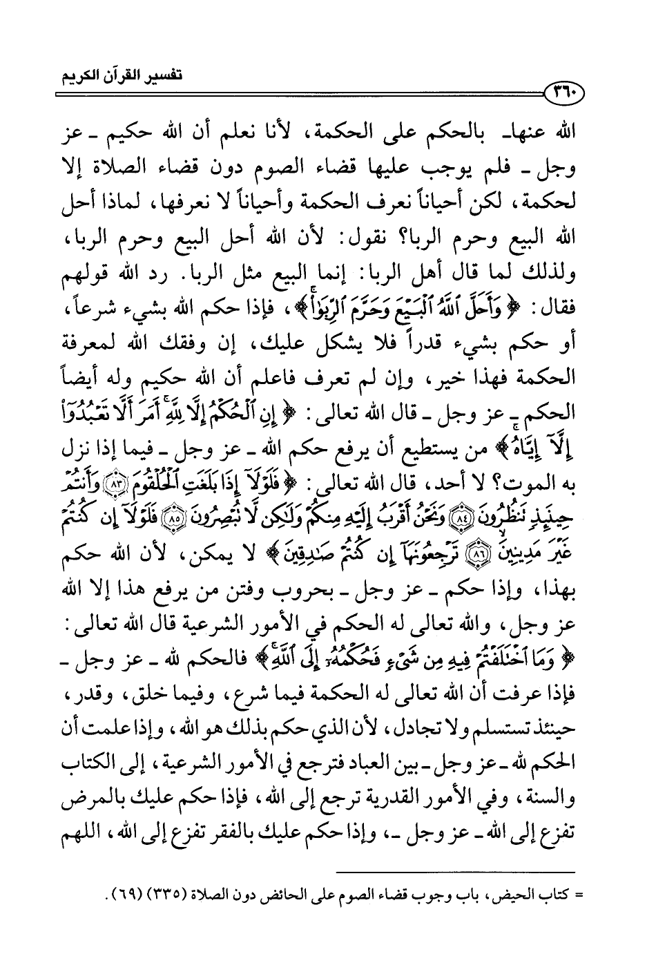 رد الله قولهم فقال: {وأحل الله البيع وحرم الربا} ، فإذا حكم الله بشيء شرعاً، أو حكم بشيء قدراً فلا يشكل عليك، إن وفقك الله لمعرفة الحكمة فهذا خير، وإن لم تعرف فاعلم أن الله حكيم وله أيضاً الحكم - عز وجل - قال الله تعالى: {إن الحكم إلا لله أمر ألا تعبدوا إلا إياه} من يستطيع أن يرفع حكم الله - عز وجل - فيما إذا نزل به الموت؟ لا أحد، قال الله تعالى: {فلولا إذا بلغت الحلقوم وأنتم حينئذ تنظرون ونحن أقرب إليه منكم ولكن لا تبصرون فلولا إن كنتم غير مدينين ترجعونهآ إن كنتم صادقين} لا يمكن، لأن الله حكم بهذا، وإذا حكم - عز وجل - بحروب وفتن من يرفع هذا إلا الله عز وجل، والله تعالى له الحكم في الأمور الشرعية قال الله تعالى: {وما اختلفتم فيه من شيء فحكمه إلى الله} فالحكم لله - عز وجل - فإذا عرفت أن الله تعالى له الحكمة فيما شرع، وفيما خلق، وقدر، حينئذ تستسلم ولا تجادل، لأن الذي حكم بذلك هو الله، وإذا علمت أن الحكم لله - عز وجل - بين العباد فترجع الأمور الشرعية، إلى الكتاب والسنة، وفي الأمور القدرية ترجع إلى الله، فإذا حكم عليك بالمرض تفزع إلى الله - عز وجل -، وإذا حكم عليك بالفقر تفزع إلى الله، اللهم