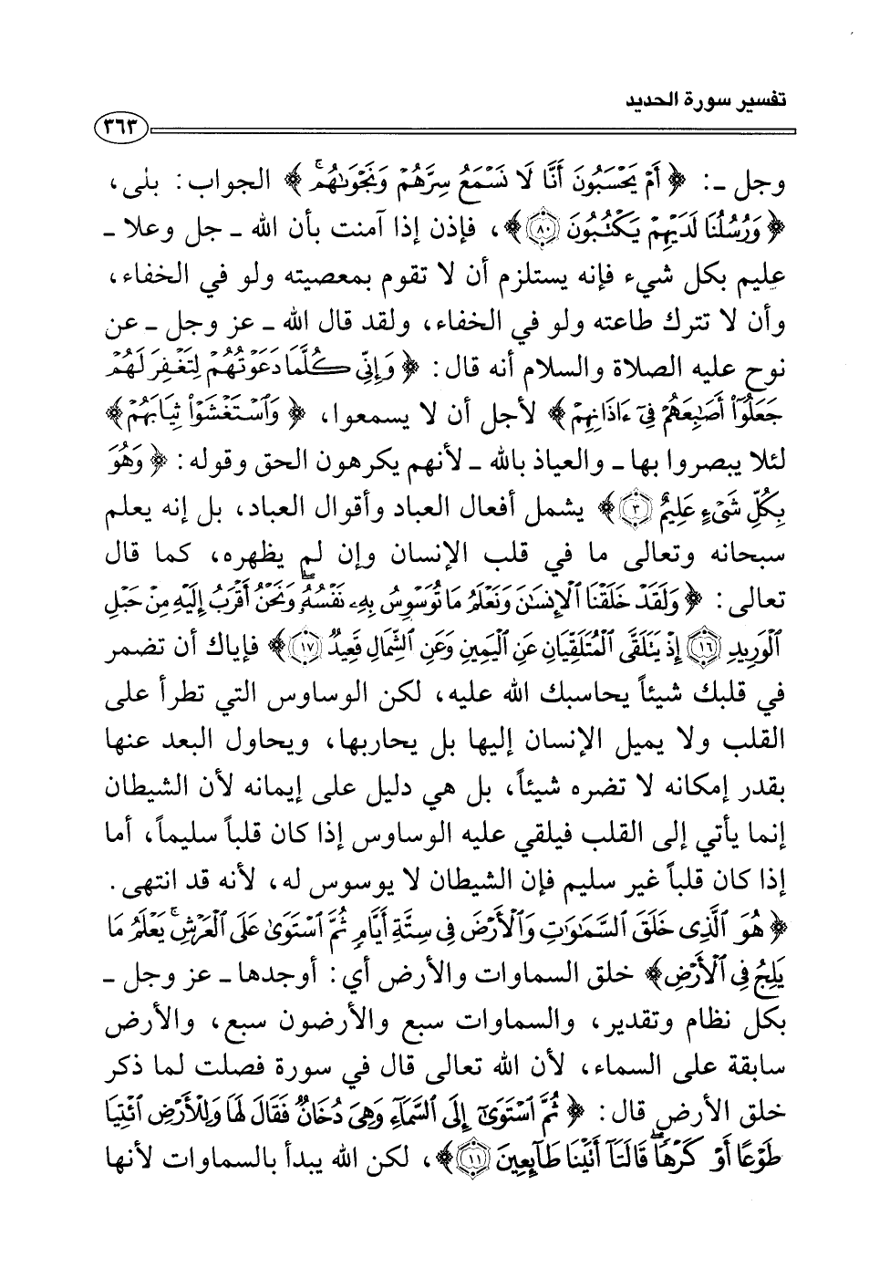 الإنسان وإن لم يظهره، كما قال تعالى: {ولقد خلقنا الإنسان ونعلم ما توسوس به نفسه ونحن أقرب إليه من حبل الوريد إذ يتلقى المتلقيان عن اليمين وعن الشمال قعيد} فإياك أن تضمر في قلبك شيئاً يحاسبك الله عليه، لكن الوساوس التي تطرأ على القلب ولا يميل الإنسان إليها بل يحاربها، ويحاول البعد عنها بقدر إمكانه لا تضره شيئاً، بل هي دليل على إيمانه لأن الشيطان إنما يأتي إلى القلب فيلقي عليه الوساوس إذا كان قلباً سليماً، أما إذا كان قلباً غير سليم فإن الشيطان لا يوسوس له، لأنه قد انتهى. {هو الذي خلق السماوات والأَرض في ستة أيام ثم استوى على العرش يعلم ما يلج في الأَرض} خلق السماوات والأرض أي: أوجدها - عز وجل - بكل نظام وتقدير، والسماوات سبع والأرضون سبع، والأرض سابقة على السماء، لأن الله تعالى قال في سورة فصلت لما ذكر خلق الأرض قال: {ثم استوى إلى السماء وهي دخان فقال لها وللأَرض ائتيا طوعاً أو كرهاً قالتآ أتينا طآئعين} ، لكن الله يبدأ بالسماوات لأنها