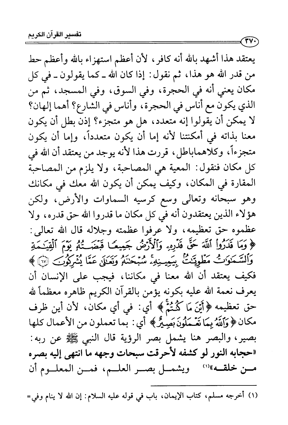 يعتقد هذا أشهد بالله أنه كافر، لأن أعظم استهزاء بالله وأعظم حط من قدر الله هو هذا، ثم نقول: إذا كان الله - كما يقولون - في كل مكان يعني أنه في الحجرة، وفي السوق، وفي المسجد، ثم من الذي يكون مع أناس في الحجرة، وأناس في الشارع؟ أهما إلهان؟ لا يمكن أن يقولوا إنه متعدد، هل هو متجزء؟ إذن بطل أن يكون معنا بذاته في أمكنتنا لأنه إما أن يكون متعدداً، وإما أن يكون متجزءاً، وكلاهما باطل، قررت هذا لأنه يوجد من يعتقد أن الله في كل مكان فنقول: المعية هي المصاحبة، ولا يلزم من المصاحبة المقارة في المكان، وكيف يمكن أن يكون الله معك في مكانك وهو سبحانه وتعالى وسع كرسيه السماوات والأرض، ولكن هؤلاء الذين يعتقدون أنه في كل مكان ما قدروا الله حق قدره، ولا عظموه حق تعظيمه، ولا عرفوا عظمته وجلاله قال الله تعالى: {وما قدروا الله حق قدره والأَرض جميعاً قبضته يوم القيامة والسماوات مطويت بيمينه سبحانه وتعالى عما يشركون} فكيف يعتقد أن الله معنا في مكاننا، فيجب على الإنسان أن يعرف نعمة الله عليه بكونه يؤمن بالقرآن الكريم ظاهره معظماً لله حق تعظيمه {أين ما كنتم} أي: في أي مكان، لأن أين ظرف مكان {والله بما تعملون بصير} أي: بما تعملون من الأعمال كلها بصير، والبصر هنا يشمل بصر الرؤية قال النبي صلى الله عليه وسلم عن ربه: «حجابه النور لو كشفه لأحرقت سبحات وجهه ما انتهى إليه بصره من خلقه» (¬1) ويشمل بصر العلم، فمن المعلوم أن