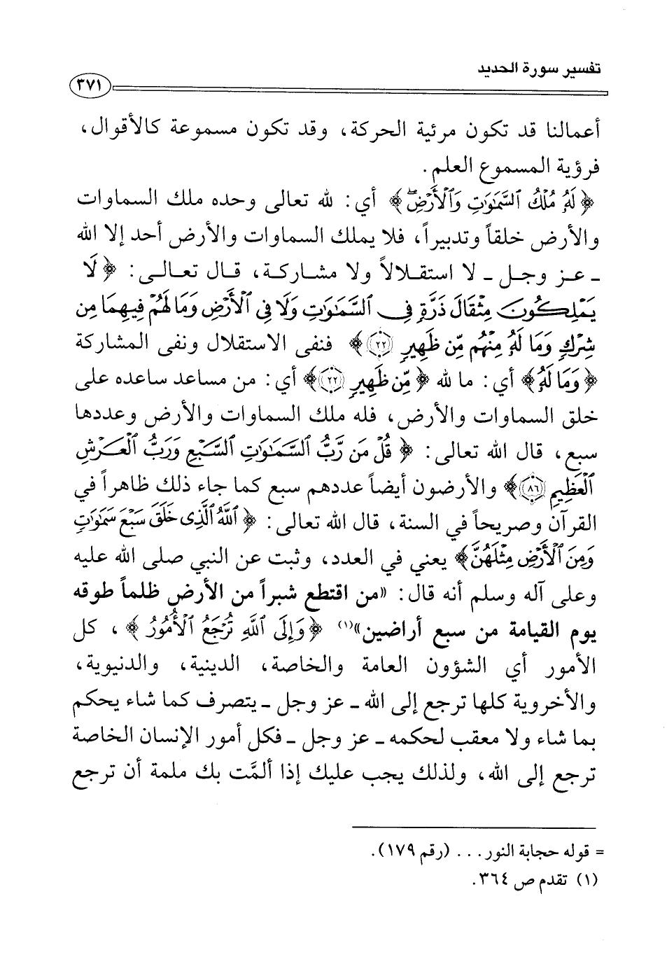 {وإلى الله ترجع الأُمور} ، كل الأمور أي الشؤون العامة والخاصة، الدينية، والدنيوية، والأخروية كلها ترجع إلى الله - عز وجل - يتصرف كما شاء يحكم بما شاء ولا معقب لحكمه - عز وجل - فكل أمور الإنسان الخاصة ترجع إلى الله، ولذلك يجب عليك إذا ألمَّت بك ملمة أن ترجع