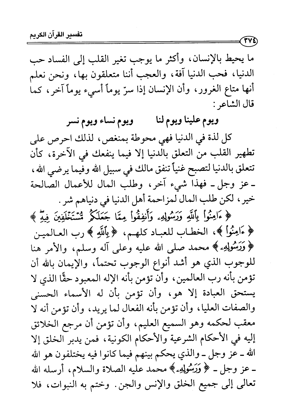 {آمنوا بالله ورسوله وأنفقوا مما جعلكم مستخلفين فيه} {آمنوا} ، الخطاب للعباد كلهم، {بالله} رب العالمين {ورسوله} محمد صلى الله عليه وعلى آله وسلم، والأمر هنا للوجوب الذي هو أشد أنواع الوجوب تحتماً، والإيمان بالله أن تؤمن بأنه رب العالمين، وأن تؤمن بأنه الإله المعبود حقًّا الذي لا يستحق العبادة إلا هو، وأن تؤمن بأن له الأسماء الحسنى والصفات العليا، وأن تؤمن بأنه الفعال لما يريد، وأن تؤمن أنه لا معقب لحكمه وهو السميع العليم، وأن تؤمن أن مرجع الخلائق إليه في الأحكام الشرعية والأحكام الكونية، فمن يدبر الخلق إلا الله - عز وجل - والذي يحكم بينهم فيما كانوا فيه يختلفون هو الله - عز وجل - {ورسوله} محمد عليه الصلاة والسلام، أرسله الله تعالى إلى جميع الخلق والإنس والجن. وختم به النبوات، فلا
