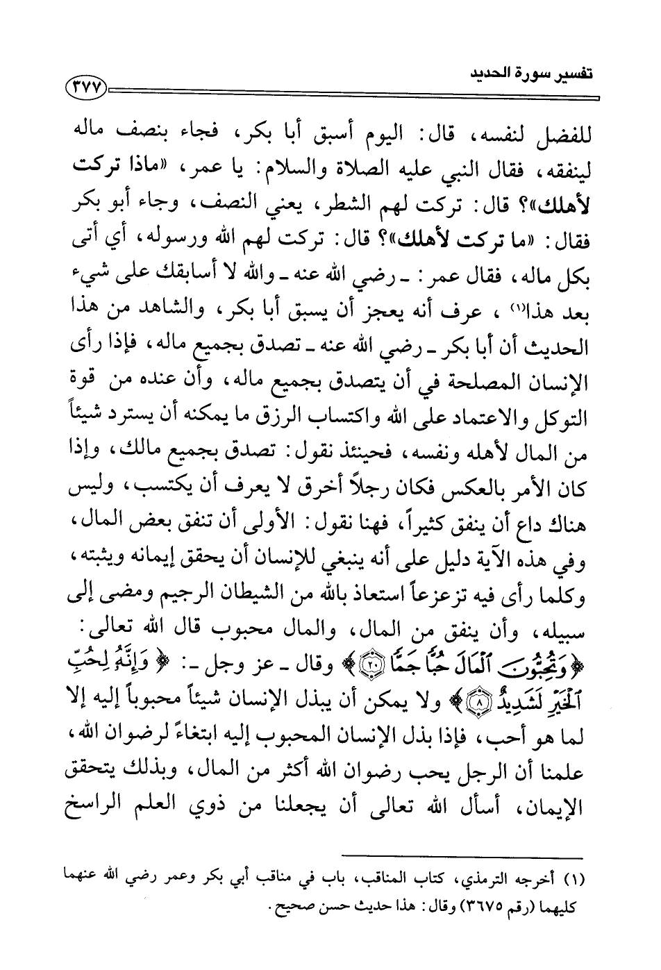 للفضل لنفسه، قال: اليوم أسبق أبا بكر، فجاء بنصف ماله لينفقه، فقال النبي عليه الصلاة والسلام: يا عمر، «ماذا تركت لأهلك» ؟ قال: تركت لهم الشطر، يعني النصف، وجاء أبو بكر فقال: «ما تركت لأهلك» ؟ قال: تركت لهم الله ورسوله، أي أتى بكل ماله، فقال عمر: - رضي الله عنه - والله لا أسابقك على شيء بعد هذا (¬1) ، عرف أنه يعجز أن يسبق أبا بكر، والشاهد من هذا الحديث أن أبا بكر - رضي الله عنه - تصدق بجميع ماله، فإذا رأى الإنسان المصلحة في أن يتصدق بجميع ماله، وأن عنده من قوة التوكل والاعتماد على الله واكتساب الرزق ما يمكنه أن يسترد شيئاً من المال لأهله ونفسه، فحينئذ نقول: تصدق بجميع مالك، وإذا كان الأمر بالعكس فكان رجلاً أخرق لا يعرف أن يكتسب، وليس هناك داع أن ينفق كثيراً، فهنا نقول: الأولى أن تنفق بعض المال، وفي هذه الآية دليل على أنه ينبغي للإنسان أن يحقق إيمانه ويثبته، وكلما رأى فيه تزعزعاً استعاذ بالله من الشيطان الرجيم ومضى إلى سبيله، وأن ينفق من المال، والمال محبوب قال الله تعالى: {وتحبون المال حباً جماً} وقال - عز وجل -: {وإنه لحب الخير لشديد} ولا يمكن أن يبذل الإنسان شيئاً محبوباً إليه إلا لما هو أحب، فإذا بذل الإنسان المحبوب إليه ابتغاءً لرضوان الله، علمنا أن الرجل يحب رضوان الله أكثر من المال، وبذلك يتحقق الإيمان، أسأل الله تعالى أن يجعلنا من ذوي العلم الراسخ