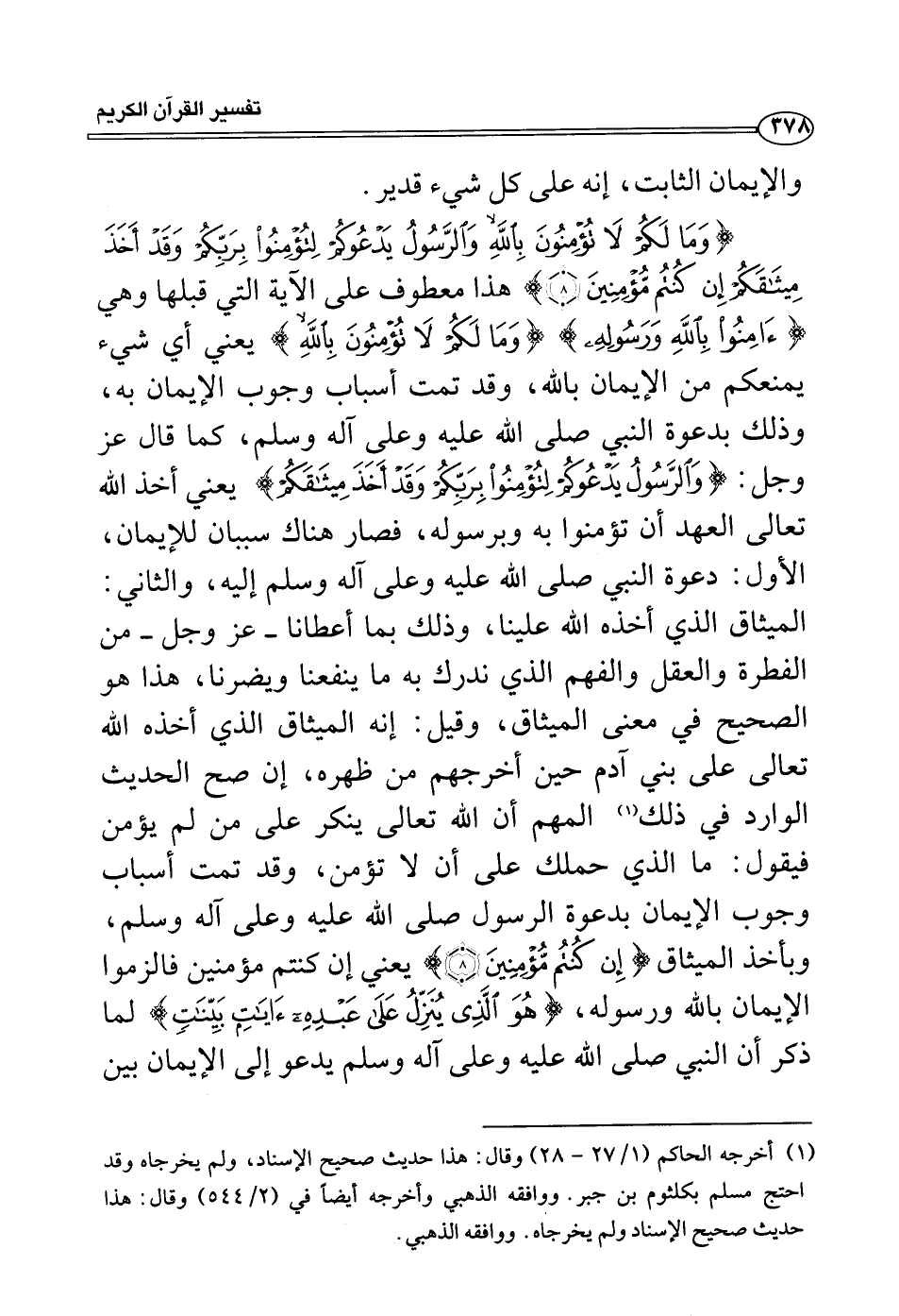 {وما لكم لا تؤمنون بالله والرسول يدعوكم لتؤمنوا بربكم وقد أخذ ميثاقكم إن كنتم مؤمنين} هذا معطوف على الآية التي قبلها وهي {آمنوا بالله ورسوله} {وما لكم لا تؤمنون بالله} يعني أي شيء يمنعكم من الإيمان بالله، وقد تمت أسباب وجوب الإيمان به، وذلك بدعوة النبي صلى الله عليه وعلى آله وسلم، كما قال عز وجل: {والرسول يدعوكم لتؤمنوا بربكم وقد أخذ ميثاقكم} يعني أخذ الله تعالى العهد أن تؤمنوا به وبرسوله، فصار هناك سببان للإيمان، الأول: دعوة النبي صلى الله عليه وعلى آله وسلم إليه، والثاني: الميثاق الذي أخذه الله علينا، وذلك بما أعطانا - عز وجل - من الفطرة والعقل والفهم الذي ندرك به ما ينفعنا ويضرنا، هذا هو الصحيح في معنى الميثاق، وقيل: إنه الميثاق الذي أخذه الله تعالى على بني آدم حين أخرجهم من ظهره، إن صح الحديث الوارد في ذلك (¬1)