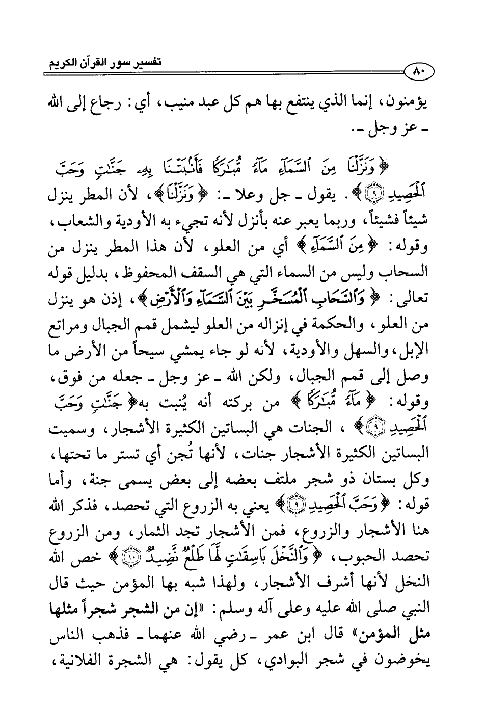{ونزلنا من السماء ماءً مبركاً فأنبتنا به جنات وحب الحصيد} . يقول - جل وعلا -: {ونزلنا} ، لأن المطر ينزل شيئاً فشيئاً، وربما يعبر عنه بأنزل لأنه تجيء به الأودية والشعاب، وقوله: {من السماء} أي من العلو، لأن هذا المطر ينزل من السحاب وليس من السماء التي هي السقف المحفوظ، بدليل قوله تعالى: {والسحاب المسخر بين السماء والأَرض} ، إذن هو ينزل من العلو، والحكمة في إنزاله من العلو ليشمل قمم الجبال ومراتع الإبل، والسهل والأودية، لأنه لو جاء يمشي سيحاً من الأرض ما وصل إلى قمم الجبال، ولكن الله - عز وجل - جعله من فوق، وقوله: {ماءً مبركاً} من بركته أنه يُنبت به {جنات وحب الحصيد} ، الجنات هي البساتين الكثيرة الأشجار، وسميت البساتين الكثيرة الأشجار جنات، لأنها تُجن أي تستر ما تحتها، وكل بستان ذو شجر ملتف بعضه إلى بعض يسمى جنة، وأما قوله: {وحب الحصيد} يعني به الزروع التي تحصد، فذكر الله هنا الأشجار والزروع، فمن الأشجار تجد الثمار، ومن الزروع تحصد الحبوب، {والنخل باسقات لها طلع نضيد} خص الله النخل لأنها أشرف الأشجار، ولهذا شبه بها المؤمن حيث قال النبي صلى الله عليه وعلى آله وسلم: «إن من الشجر شجراً مثلها مثل المؤمن» قال ابن عمر - رضي الله عنهما - فذهب الناس يخوضون في شجر البوادي، كل يقول: هي الشجرة الفلانية،