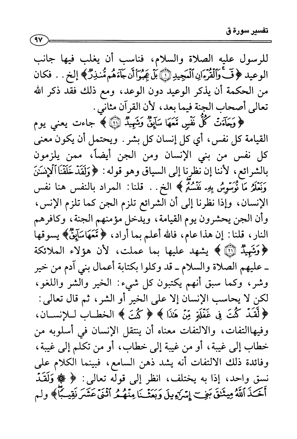 قلنا: المراد بالنفس هنا نفس الإنسان، وإذا نظرنا إلى أن الشرائع تلزم الجن كما تلزم الإنس، وأن الجن يحشرون يوم القيامة، ويدخل مؤمنهم الجنة، وكافرهم النار، قلنا: إن هذا عام، فالله أعلم بما أراد، {معها سآئق} يسوقها {وشهيد} يشهد عليها بما عملت، لأن هؤلاء الملائكة - عليهم الصلاة والسلام - قد وكلوا بكتابة أعمال بني آدم من خير وشر، وكما سبق أنهم يكتبون كل شيء: الخير والشر واللغو، لكن لا يحاسب الإنسان إلا على الخير أو الشر، ثم قال تعالى: {لقد كنت في غفلة من هذا} {كنت} الخطاب للإنسان، وفيهاالتفات، والالتفات معناه أن ينتقل الإنسان في أسلوبه من خطاب إلى غيبة، أو من غيبة إلى خطاب، أو من تكلم إلى غيبة، وفائدة ذلك الالتفات أنه يشد ذهن السامع، فبينما الكلام على نسق واحد، إذا به يختلف، انظر إلى قوله تعالى: {ولقد أخذ الله ميثاق بني إسرءيل وبعثنا منهم اثنى عشر نقيباً} ولم
