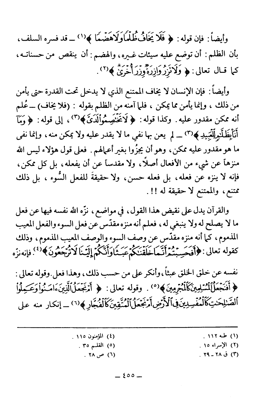 وَأَيْضًا فَإِنَّ الْإِنْسَانَ لَا يَخَافُ الْمُمْتَنِعَ الَّذِي لَا يَدْخُلُ تَحْتَ الْقُدْرَةِ حَتَّى يَأْمَنَ مِنْ ذَلِكَ، وَإِنَّمَا يَأْمَنُ مِمَّا يُمْكِنُ، فَلَمَّا آمَنَهُ من الظلم بقوله: {فَلَا يَخَافُ} - عُلِمَ أَنَّهُ مُمْكِنٌ مَقْدُورٌ عَلَيْهِ. وَكَذَا قَوْلُهُ: {لَا تَخْتَصِمُوا لَدَيَّ} (¬3) إلى قوله: {وَمَا أَنَا بِظَلَّامٍ لِلْعَبِيدِ} (¬4) - لَمْ يَعْنِ بِهَا نَفْيَ مَا لَا يُقْدَرُ عَلَيْهِ وَلَا يُمْكَنُ مِنْهُ، وَإِنَّمَا نَفَى مَا هُوَ مَقْدُورٌ عَلَيْهِ مُمْكِنٌ، وَهُوَ أَنْ يُجْزَوْا بِغَيْرِ أَعْمَالِهِمْ. فَعَلَى قَوْلِ هَؤُلَاءِ لَيْسَ اللَّهُ مُنَزَّهًا عَنْ شَيْءٍ مِنَ الْأَفْعَالِ أَصْلًا، وَلَا مُقَدَّسًا عَنْ أَنْ يَفْعَلَهُ، بَلْ كُلُّ مُمْكِنٍ فَإِنَّهُ لَا يُنَزَّهُ عَنْ فِعْلِهِ، بَلْ فِعْلُهُ حَسَنٌ، وَلَا حَقِيقَةَ لِلْفِعْلِ السُّوءِ، بَلْ ذَلِكَ مُمْتَنِعٌ، وَالْمُمْتَنِعُ لَا حَقِيقَةَ لَهُ!!