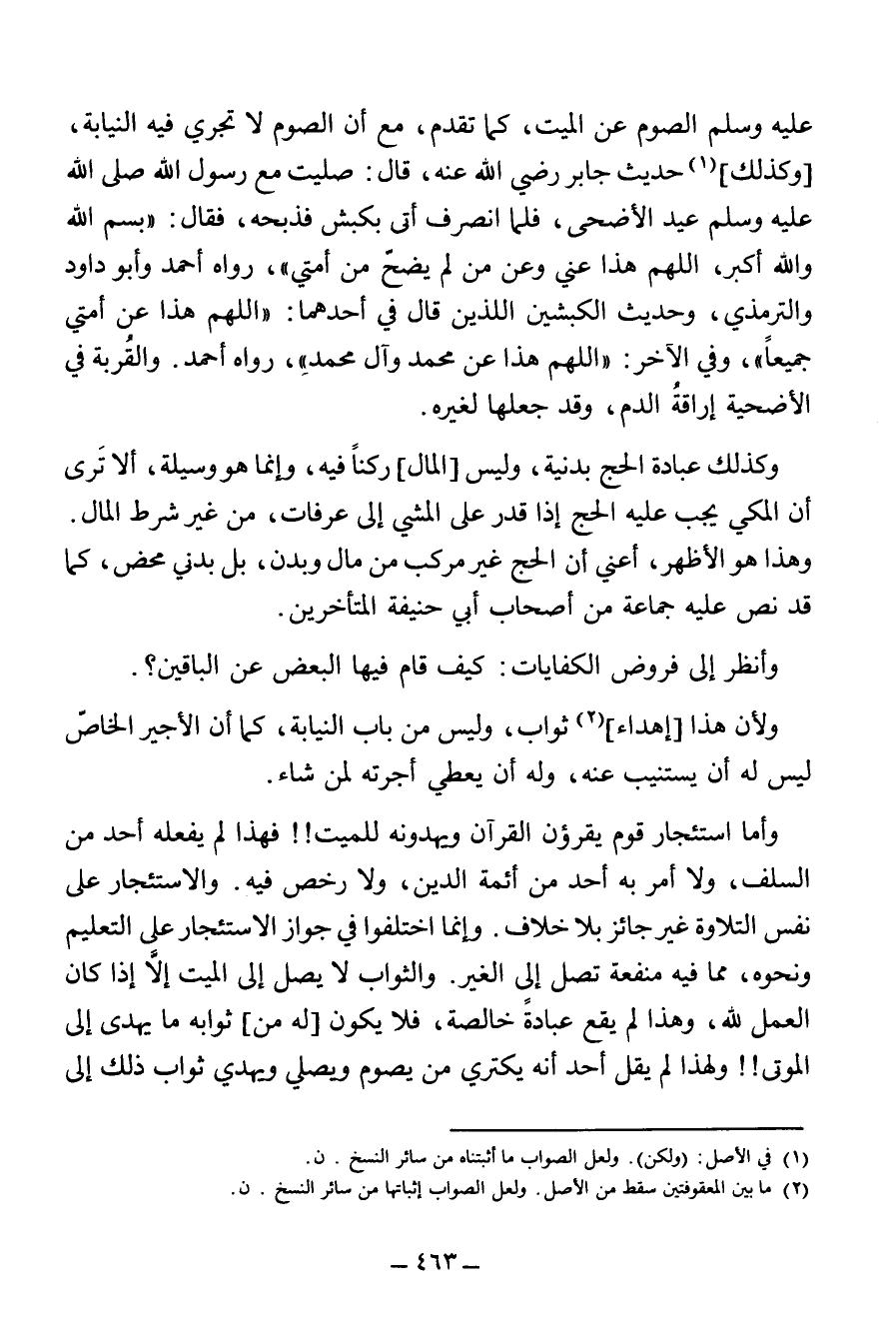 وَسَلَّمَ الصَّوْمَ عَنِ الْمَيِّتِ، كَمَا تَقَدَّمَ، مَعَ أن الصوم لا تجزي فِيهِ النِّيَابَةُ، [وَكَذَلِكَ] (¬1) حَدِيثُ جَابِرٍ رَضِيَ اللَّهُ عَنْهُ، قَالَ: «صَلَّيْتُ مَعَ رَسُولِ اللَّهِ صَلَّى اللَّهُ عَلَيْهِ وَسَلَّمَ عِيدَ الْأَضْحَى، فَلَمَّا انْصَرَفَ أَتَى بِكَبْشٍ فَذَبَحَهُ، فَقَالَ: "بِسْمِ اللَّهِ وَاللَّهُ أَكْبَرُ، اللَّهُمَّ هَذَا عَنِّي وَعَمَّنْ لَمْ يُضَحِّ مِنْ أُمَّتِي»، رَوَاهُ أَحْمَدُ وَأَبُو دَاوُدَ وَالتِّرْمِذِيُّ، وَحَدِيثُ الْكَبْشَيْنِ اللَّذَيْنِ قَالَ فِي أَحَدِهِمَا: «اللَّهُمَّ هَذَا عَنْ أُمَّتِي جَمِيعًا»، وَفِي الْآخَرِ: «اللَّهُمَّ هَذَا عَنْ مُحَمَّدٍ وَآلِ مُحَمَّدٍ» "، رَوَاهُ أَحْمَدُ. وَالْقُرْبَةُ فِي الْأُضْحِيَّةِ إِرَاقَةُ الدَّمِ، وَقَدْ جَعَلَهَا لِغَيْرِهِ.