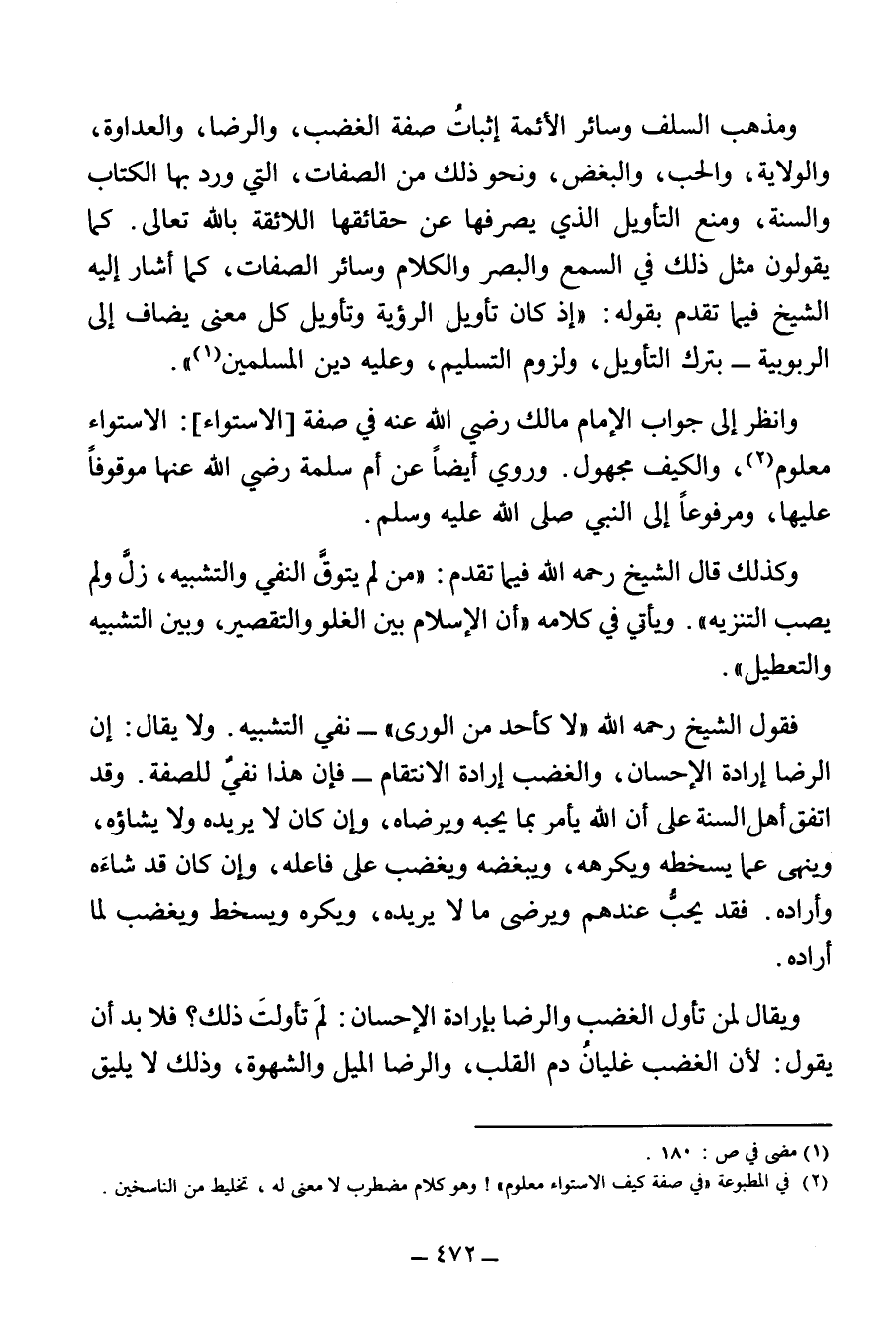 وَمَذْهَبُ السَّلَفِ وَسَائِرُ الْأَئِمَّةِ إِثْبَاتُ صِفَةِ الْغَضَبِ، وَالرِّضَى، وَالْعَدَاوَةِ، وَالْوِلَايَةِ، وَالْحُبِّ، وَالْبُغْضِ، وَنَحْوِ ذَلِكَ مِنَ الصِّفَاتِ، الَّتِي وَرَدَ بِهَا الْكِتَابُ وَالسَّنَةُ، وَمَنْعُ التَّأْوِيلِ الَّذِي يَصْرِفُهَا عَنْ حَقَائِقِهَا اللَّائِقَةِ بِاللَّهِ تَعَالَى. كَمَا يَقُولُونَ مِثْلَ ذَلِكَ فِي السَّمْعِ وَالْبَصَرِ وَالْكَلَامِ وَسَائِرِ الصِّفَاتِ، كَمَا أَشَارَ إِلَيْهِ الشَّيْخُ فِيمَا تَقَدَّمَ بِقَوْلِهِ: "إِذْ كَانَ تَأْوِيلُ الرُّؤْيَةِ وَتَأْوِيلُ كُلِّ مَعْنًى يُضَافُ إِلَى الربوبية - بترك التَّأْوِيلِ، وَلُزُومَ التَّسْلِيمِ، وَعَلَيْهِ دِينُ الْمُسْلِمِينَ" (¬1).