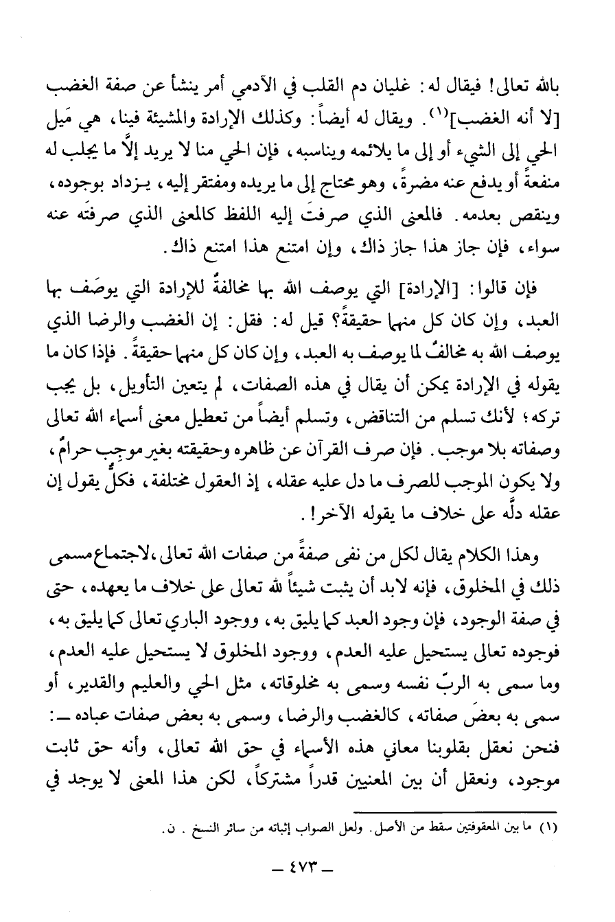 فإن قالوا: [الْإِرَادَةُ] الَّتِي يُوصَفُ اللَّهُ بِهَا مُخَالِفَةٌ لِلْإِرَادَةِ الَّتِي يُوصَفُ بِهَا الْعَبْدُ، وَإِنْ كَانَ كُلٌّ مِنْهُمَا حَقِيقَةً؟ قِيلَ لَهُ: فَقُلْ: إِنَّ الْغَضَبَ والرضا الَّذِي يُوصَفُ اللَّهُ بِهِ مُخَالِفٌ لِمَا يُوصَفُ بِهِ الْعَبْدُ، وَإِنْ كَانَ كُلٌّ مِنْهُمَا حَقِيقَةً. فَإِذَا كَانَ مَا يَقُولُهُ فِي الْإِرَادَةِ يُمْكِنُ أَنْ يُقَالَ فِي هَذِهِ الصِّفَاتِ، لَمْ يَتَعَيَّنِ التَّأْوِيلُ، بَلْ يَجِبُ تَرْكُهُ؛ لِأَنَّكَ تَسْلَمُ مِنَ التَّنَاقُضِ، وَتَسْلَمُ أَيْضًا مِنْ تَعْطِيلِ مَعْنَى أَسْمَاءِ اللَّهِ تَعَالَى وَصِفَاتِهِ بِلَا مُوجِبٍ. فَإِنَّ صَرْفَ الْقُرْآنِ عَنْ ظَاهِرِهِ وَحَقِيقَتِهِ بِغَيْرِ مُوجِبٍ حَرَامٌ، ولا يكون الموجب للصرف ما دل عَلَيْهِ عَقْلُهُ، إِذِ الْعُقُولُ مُخْتَلِفَةٌ، فَكَلٌّ يَقُولُ إن عقله دل عَلَى خِلَافِ مَا يَقُولُهُ الْآخَرُ!