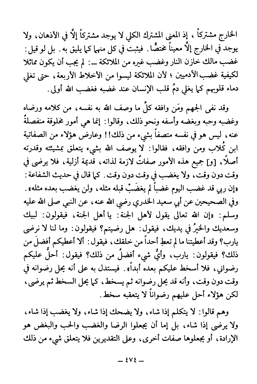 وَعَارَضَ هَؤُلَاءِ مِنَ الصِّفَاتِيَّةِ ابْنُ كُلَّابٍ وَمَنْ وَافَقَهُ، فَقَالُوا: لَا يُوصَفُ اللَّهُ بشيء يتعلق بمشيئته وقدرته أصلا، [و] جَمِيعُ هَذِهِ الْأُمُورِ صِفَاتٌ لَازِمَةٌ لِذَاتِهِ، قَدِيمَةٌ أَزَلِيَّةٌ، فَلَا يَرْضَى فِي وَقْتٍ دُونَ وَقْتٍ، وَلَا يَغْضَبُ فِي وَقْتٍ دُونَ وَقْتٍ. كَمَا قَالَ فِي حَدِيثِ الشَّفَاعَةِ: «إِنَّ رَبِّي قَدْ غَضِبَ الْيَوْمَ غَضَبًا لَمْ يَغْضَبْ قَبْلَهُ مِثْلَهُ، وَلَنْ يَغْضَبَ بَعْدَهُ مِثْلَهُ».