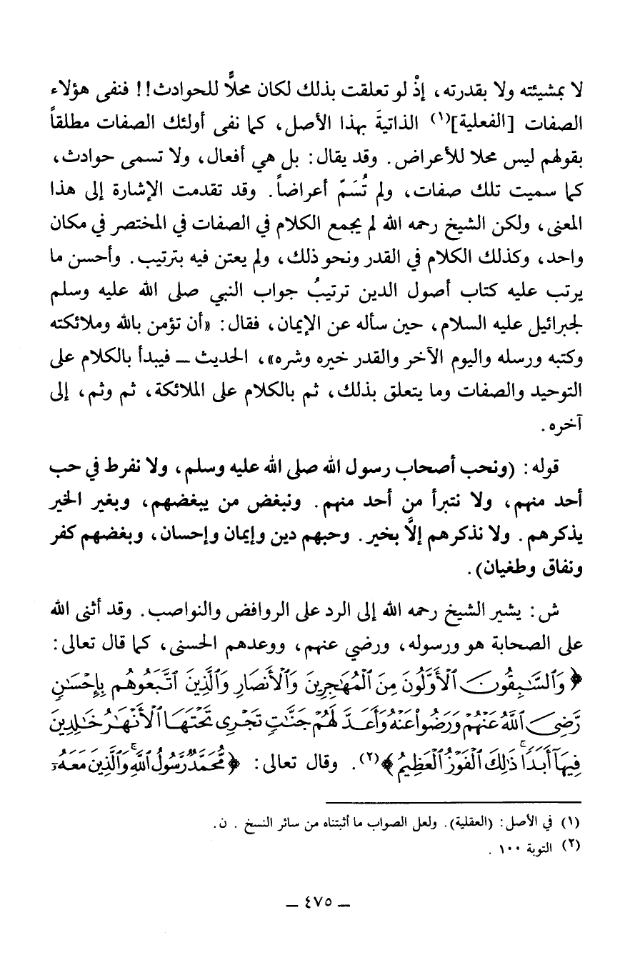 ش: يُشِيرُ الشَّيْخُ رَحِمَهُ اللَّهُ إِلَى الرَّدِّ عَلَى الروافض والنواصب. وقد أثنى الله عَلَى الصَّحَابَةِ هُوَ وَرَسُولُهُ، وَرَضِيَ عَنْهُمْ، وَوَعَدَهُمُ الْحُسْنَى كَمَا قَالَ تَعَالَى: {وَالسَّابِقُونَ الْأَوَّلُونَ مِنَ الْمُهَاجِرِينَ وَالْأَنْصَارِ وَالَّذِينَ اتَّبَعُوهُمْ بِإِحْسَانٍ رَضِيَ اللَّهُ عَنْهُمْ وَرَضُوا عَنْهُ وَأَعَدَّ لَهُمْ جَنَّاتٍ تَجْرِي تَحْتَهَا الْأَنْهَارُ خَالِدِينَ فِيهَا أَبَدًا ذَلِكَ الْفَوْزُ الْعَظِيمُ} (¬2).