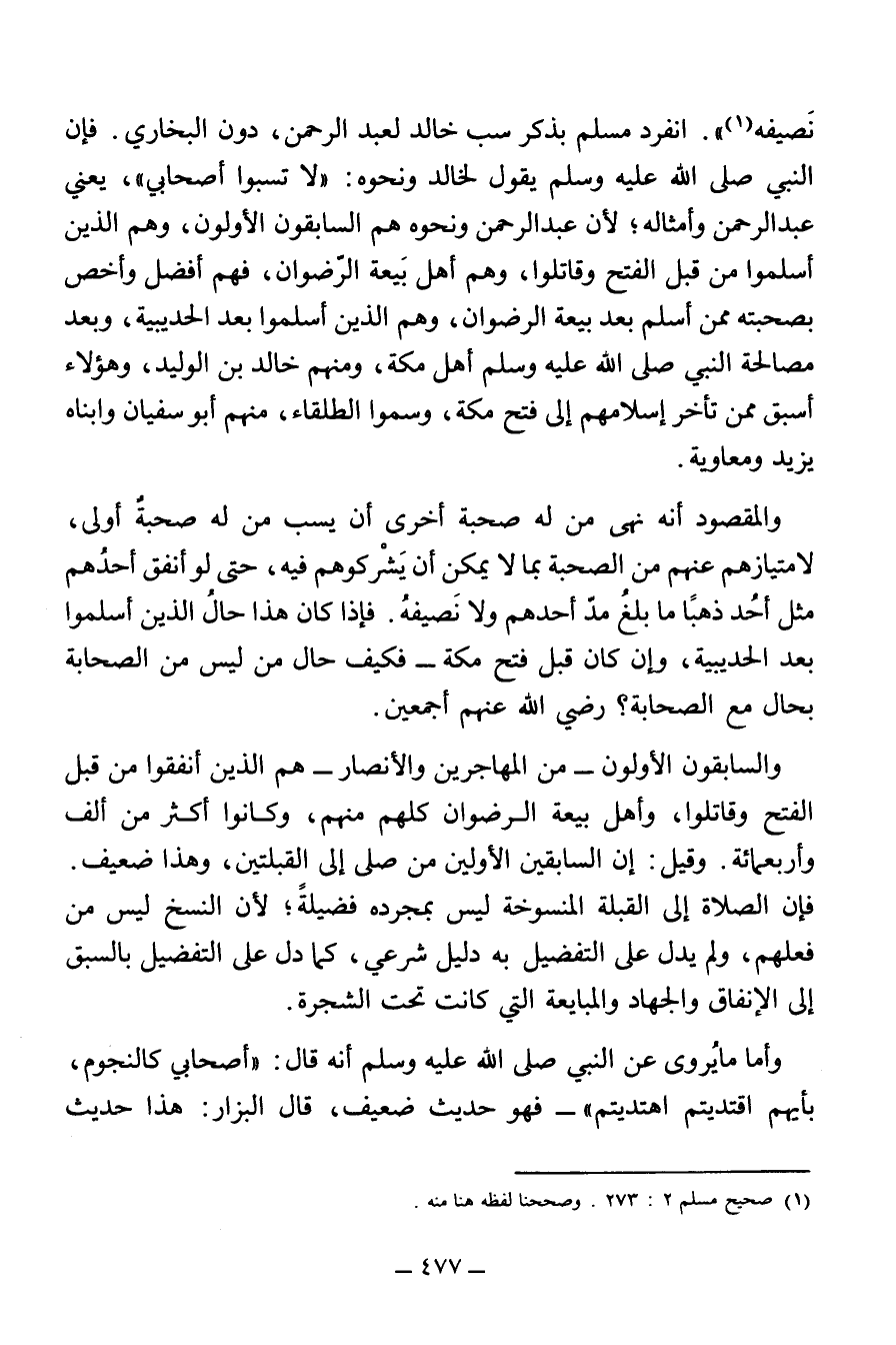 نَصِيفَهُ» (¬1). انْفَرَدَ مُسْلِمٌ بِذِكْرِ سَبِّ خَالِدٍ لِعَبْدِ الرحمن، دون البخاري. فإن النبي صَلَّى اللَّهُ عَلَيْهِ وَسَلَّمَ يَقُولُ لِخَالِدٍ وَنَحْوِهُ: «لَا تَسُبُّوا أَصْحَابِي»، يَعْنِي عَبْدَ الرَّحْمَنِ وَأَمْثَالَهُ، لِأَنَّ عَبْدَ الرَّحْمَنِ وَنَحْوَهُ هُمُ السَّابِقُونَ الْأَوَّلُونَ، وَهُمُ الَّذِينَ أَسْلَمُوا مِنْ قَبْلِ الْفَتْحِ وَقَاتَلُوا، وَهُمْ أَهْلُ بَيْعَةِ الرِّضْوَانِ، فَهُمْ أَفْضَلُ وَأَخَصُّ بِصُحْبَتِهِ مِمَّنْ أَسْلَمَ بَعْدَ بَيْعَةِ الرِّضْوَانِ، وَهُمُ الَّذِينَ أَسْلَمُوا بَعْدَ الْحُدَيْبِيَةِ، وَبَعْدَ مُصَالَحَةِ النَّبِيِّ صَلَّى اللَّهُ عَلَيْهِ وَسَلَّمَ أَهْلَ مَكَّةَ، وَمِنْهُمْ خَالِدُ بْنُ الْوَلِيدِ، وَهَؤُلَاءِ أَسْبَقُ مِمَّنْ تَأَخَّرَ إِسْلَامُهُمْ إِلَى فَتْحِ مَكَّةَ، وَسُمُّوا الطُّلَقَاءَ، مِنْهُمْ أَبُو سُفْيَانَ وَابْنَاهُ يَزِيدُ وَمُعَاوِيَةُ.