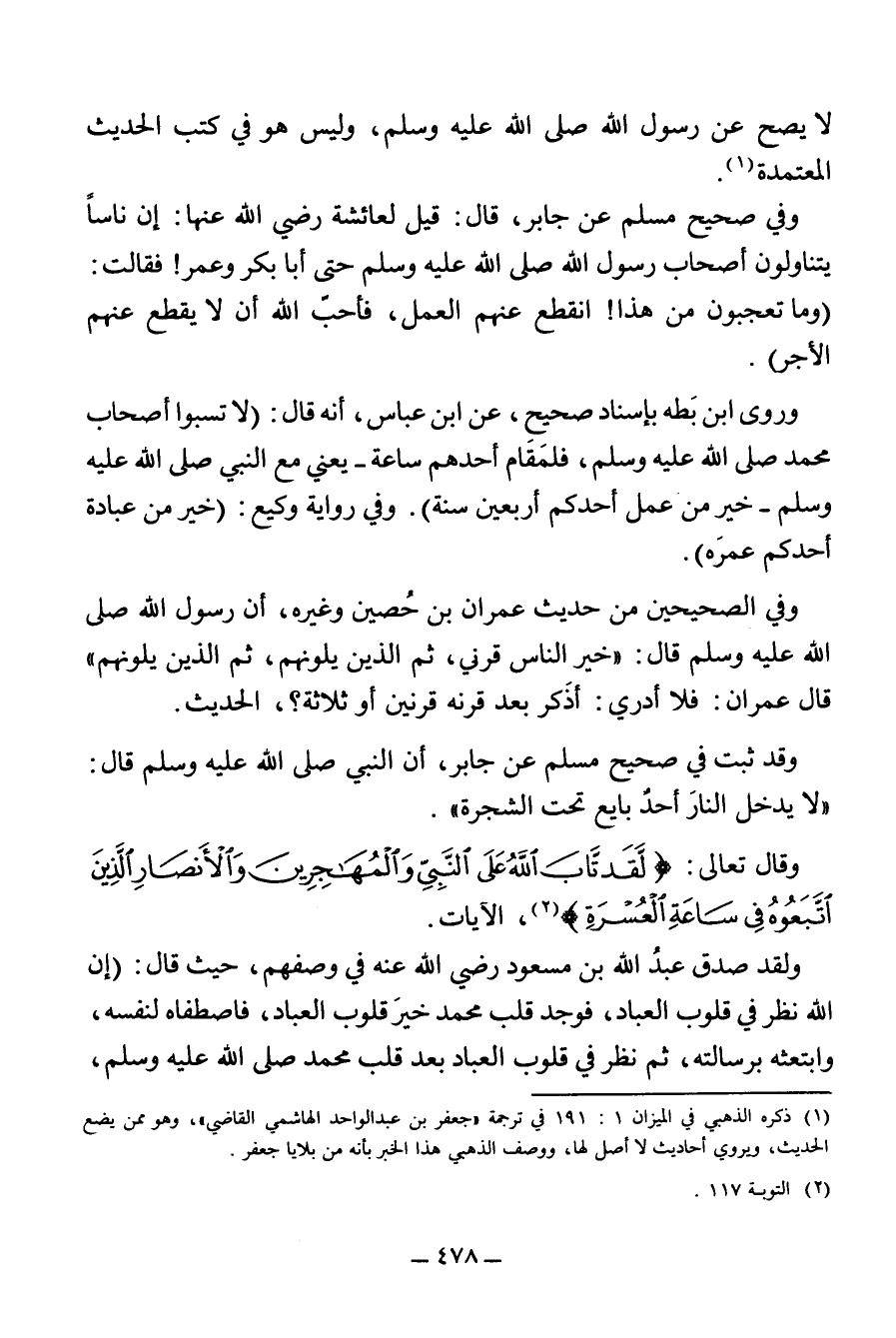 وَفِي الصَّحِيحَيْنِ مِنْ حَدِيثِ عِمْرَانَ بْنِ حُصَيْنٍ وَغَيْرِهِ، أن رسول الله صلى الله عليه وسلم قَالَ: «خَيْرُ النَّاسِ قَرْنِي، ثُمَّ الَّذِينَ يَلُونَهُمْ، ثُمَّ الَّذِينَ يَلُونَهُمْ"قَالَ عِمْرَانُ: فَلَا أَدْرِي: أَذَكَرَ بَعْدَ قَرْنِهِ قَرْنَيْنِ أَوْ ثَلَاثَةً»؟، الْحَدِيثَ.