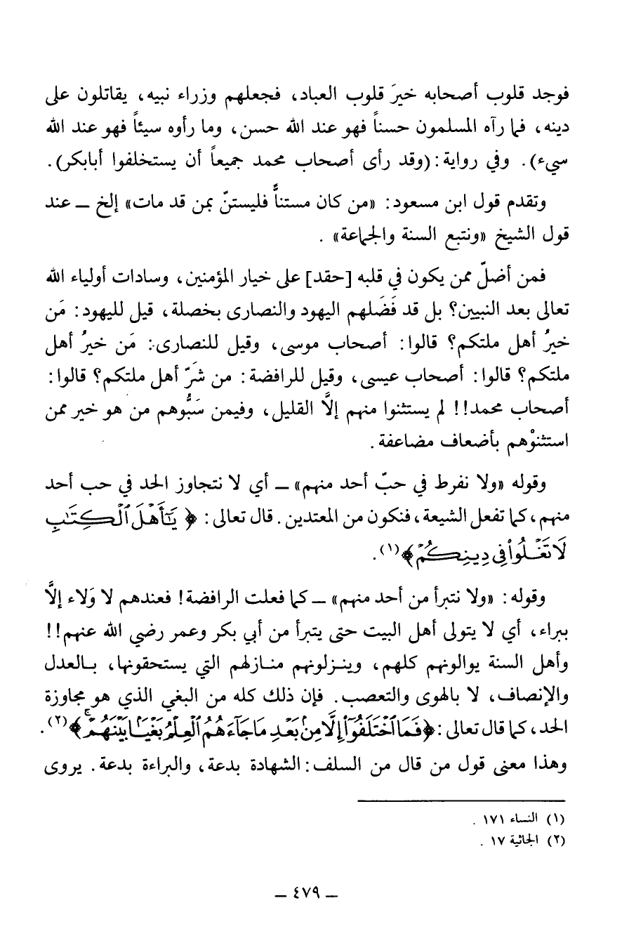وَقَوْلُهُ: "وَلَا نَتَبَرَّأُ مِنْ أَحَدٍ مِنْهُمْ"- كَمَا فَعَلَتِ الرَّافِضَةُ! فَعِنْدَهُمْ لَا وَلَاءَ إِلَّا بِبَرَاءٍ، أَيْ لَا يَتَوَلَّى أَهْلَ الْبَيْتِ حَتَّى يَتَبَرَّأَ مِنْ أَبِي بَكْرٍ وَعُمَرَ رَضِيَ اللَّهُ عَنْهُمَا!! وَأَهْلُ السُّنَّةِ يُوَالُونَهُمْ كُلَّهُمْ، وَيُنْزِلُونَهُمْ مَنَازِلَهُمُ الَّتِي يَسْتَحِقُّونَهَا، بِالْعَدْلِ وَالْإِنْصَافِ، لَا بِالْهَوَى وَالتَّعَصُّبِ. فَإِنَّ ذَلِكَ كُلَّهُ مِنَ الْبَغْيِ الَّذِي هُوَ مُجَاوَزَةُ الْحَدِّ، كَمَا قَالَ تَعَالَى: {فَمَا اخْتَلَفُوا إِلَّا مِنْ بَعْدِ مَا جَاءَهُمُ الْعِلْمُ بَغْيًا بَيْنَهُمْ} (¬2). وَهَذَا مَعْنَى قَوْلِ مَنْ قَالَ مِنَ السَّلَفِ: الشَّهَادَةُ بِدْعَةٌ، وَالْبَرَاءَةُ بِدْعَةٌ. يُرْوَى