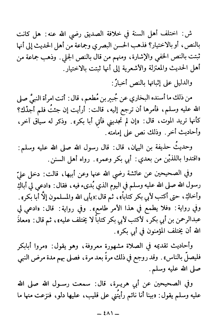 ش: اخْتَلَفَ أَهْلُ السُّنَّةِ فِي خِلَافَةِ الصِّدِّيقِ رَضِيَ اللَّهُ عَنْهُ: هَلْ كَانَتْ بِالنَّصِّ، أَوْ بِالِاخْتِيَارِ؟ فَذَهَبَ الْحَسَنُ الْبَصْرِيُّ وَجَمَاعَةٌ مِنْ أَهْلِ الْحَدِيثِ إِلَى أَنَّهَا ثَبَتَتْ بِالنَّصِّ الْخَفِيِّ وَالْإِشَارَةِ، وَمِنْهُمْ مَنْ قَالَ بِالنَّصِّ الْجَلِيِّ. وَذَهَبَ جَمَاعَةٌ مِنْ أَهْلِ الْحَدِيثِ وَالْمُعْتَزِلَةِ وَالْأَشْعَرِيَّةِ إِلَى أَنَّهَا ثَبَتَتْ بِالِاخْتِيَارِ.