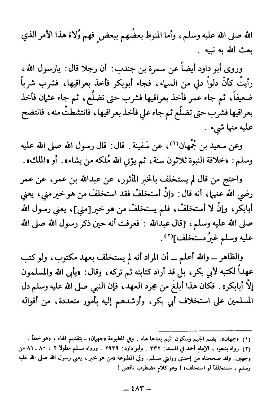 (¬2) رواه بنحوه، الإمام أحمد في المسند: 332. وأبو داود: 2939. ورواه مسلم مطولا 2: 80 - 81 من وجهين. وقد صححناه من إحدى روايتي مسلم. وفي المطبوعة «من هو خير، يَعْنِي رَسُولَ اللَّهِ صَلَّى اللَّهُ عَلَيْهِ وَسَلَّمَ، مستخلفا لو استخلف»! وهو كلام مضطرب ناقص!