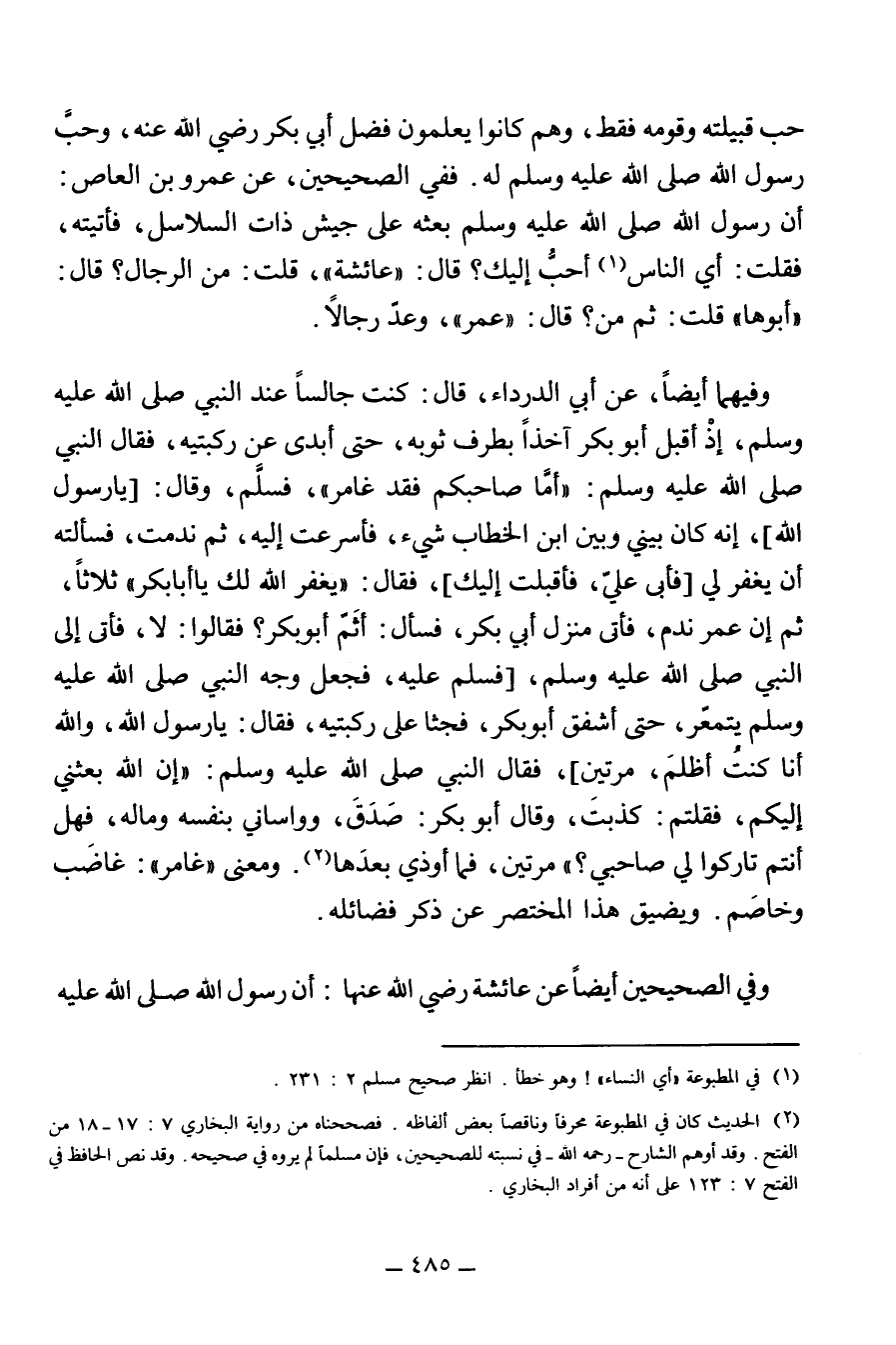 وَفِيهِمَا أَيْضًا، عَنْ أَبِي الدَّرْدَاءِ، قَالَ: «كُنْتُ جَالِسًا عِنْدَ النَّبِيِّ صَلَّى اللَّهُ عَلَيْهِ وَسَلَّمَ، إِذْ أَقْبَلَ أَبُو بَكْرٍ آخِذًا بِطَرَفِ ثَوْبِهِ، حَتَّى أَبْدَى عَنْ رُكْبَتَيْهِ، فَقَالَ النَّبِيُّ صَلَّى اللَّهُ عَلَيْهِ وَسَلَّمَ: أَمَّا صَاحِبُكُمْ فَقَدْ غَامَرَ، فَسَلَّمَ، وَقَالَ: [يا رسول الله]، إِنَّهُ كَانَ بَيْنِي وَبَيْنَ ابْنِ الْخَطَّابِ شَيْءٌ فَأَسْرَعْتُ إِلَيْهِ، ثُمَّ نَدِمْتُ، فَسَأَلْتُهُ أَنْ يَغْفِرَ لِي [فَأَبَى عَلَيَّ، فَأَقْبَلْتُ إِلَيْكَ]، فَقَالَ: يَغْفِرُ اللَّهُ لَكَ يَا أَبَا بَكْرٍ، ثَلَاثًا، ثُمَّ إِنَّ عُمَرَ نَدِمَ، فَأَتَى مَنْزِلَ أَبِي بَكْرٍ، فَسَأَلَ: أَثَمَّ أَبُو بَكْرٍ؟ فَقَالُوا: لَا، فَأَتَى إِلَى النَّبِيِّ صَلَّى اللَّهُ عَلَيْهِ وَسَلَّمَ، [فَسَلَّمَ عَلَيْهِ، فَجَعَلَ وَجْهُ النَّبِيِّ صَلَّى اللَّهُ عَلَيْهِ وَسَلَّمَ يَتَمَعَّرُ، حَتَّى أَشْفَقَ أَبُو بَكْرٍ فَجَثَا عَلَى رُكْبَتَيْهِ، فَقَالَ: يَا رَسُولَ اللَّهِ، وَاللَّهِ أَنَا كُنْتُ أَظْلَمَ، مَرَّتَيْنِ]، فَقَالَ النَّبِيُّ صَلَّى اللَّهُ عَلَيْهِ وَسَلَّمَ: "إِنَّ اللَّهَ بَعَثَنِي إِلَيْكُمْ، فَقُلْتُمْ: كَذَبْتَ، وَقَالَ أَبُو بَكْرٍ: صَدَقَ، وَوَاسَانِي بِنَفْسِهِ وَمَالِهِ، فَهَلْ أَنْتُمْ تَارِكُو لِي صَاحِبِي؟ مَرَّتَيْنِ، فَمَا أُوذِيَ بَعْدَهَا» (¬2). وَمَعْنَى: غَامَرَ: غَاضَبَ وَخَاصَمَ. وَيَضِيقُ هَذَا الْمُخْتَصَرُ عَنْ ذِكْرِ فَضَائِلِهِ.