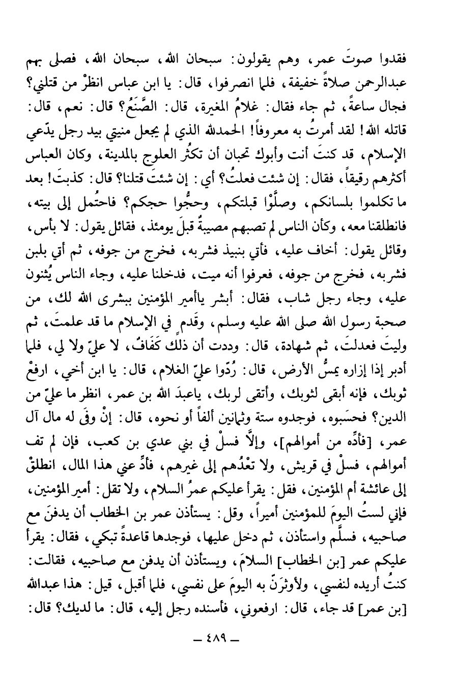 فَقَدُوا صَوْتَ عُمَرَ، وَهُمْ يَقُولُونَ: سُبْحَانَ اللَّهِ، سُبْحَانَ اللَّهِ، فَصَلَّى بِهِمْ عَبْدُ الرَّحْمَنِ صَلَاةً خَفِيفَةً، فَلَمَّا انْصَرَفُوا، قَالَ: يَا ابْنَ عَبَّاسٍ انْظُرْ مَنْ قَتَلَنِي؟ فَجَالَ سَاعَةً، ثُمَّ جَاءَ فَقَالَ: غُلَامُ الْمُغِيرَةِ، قَالَ: الصَّنَعُ؟ قَالَ: نَعَمْ، قَالَ: قَاتَلَهُ اللَّهُ! لَقَدْ أَمَرْتُ بِهِ مَعْرُوفًا! الْحَمْدُ لِلَّهِ الَّذِي لَمْ يَجْعَلْ مَنِيَّتِي عَلَى يَدِ رَجُلٍ يَدَّعِي الْإِسْلَامَ، قَدْ كُنْتَ أَنْتَ وَأَبُوكَ تُحِبَّانِ أَنْ تَكْثُرَ الْعُلُوجُ بِالْمَدِينَةِ، وَكَانَ الْعَبَّاسُ أَكْثَرَهُمْ رَقِيقًا، فَقَالَ: إِنْ شِئْتَ فَعَلْتُ؟ أَيْ: إِنْ شِئْتَ قَتَلْنَا؟ قَالَ: كَذَبْتَ! بَعْدَ مَا تَكَلَّمُوا بِلِسَانِكُمْ، وَصَلُّوا قِبْلَتَكُمْ، وَحَجُّوا حَجَّكُمْ؟ فَاحْتُمِلَ إِلَى بَيْتِهِ، فَانْطَلَقْنَا مَعَهُ، وَكَأَنَّ النَّاسَ لَمْ تُصِبْهُمْ مُصِيبَةٌ قَبْلَ يَوْمَئِذٍ، فَقَائِلٌ يَقُولُ: لَا بَأْسَ عَلَيْهِ، وَقَائِلٌ يَقُولُ: أَخَافُ عَلَيْهِ، فَأُتِيَ بِنَبِيذٍ فَشَرِبَهُ، فَخَرَجَ مِنْ جَوْفِهِ، ثُمَّ أُتِيَ بِلَبَنٍ فَشَرِبَهُ، فَخَرَجَ مِنْ جَوْفِهِ، فَعَرَفُوا أَنَّهُ مَيِّتٌ، فَدَخَلْنَا عَلَيْهِ، وَجَاءَ النَّاسُ يُثْنُونَ عَلَيْهِ، وَجَاءَ رَجُلٌ شَابٌّ، فَقَالَ: أَبْشِرْ يَا أَمِيرَ الْمُؤْمِنِينَ بِبُشْرَى اللَّهِ لَكَ، مِنْ صُحْبَةِ رَسُولِ اللَّهِ صَلَّى اللَّهُ عَلَيْهِ وَسَلَّمَ، وَقَدَمٍ فِي الْإِسْلَامِ مَا قَدْ عَلِمْتَ، ثُمَّ وَلِيتَ فَعَدَلْتَ، ثُمَّ شَهَادَةٌ، قَالَ: وَدِدْتُ أَنَّ ذَلِكَ كَفَاف، لَا عَلَيَّ وَلَا لِيَ، فَلَمَّا أَدْبَرَ إِذَا إِزَارُهُ يَمَسُّ الْأَرْضَ، قَالَ: رُدُّوا عَلَيَّ الْغُلَامَ، قَالَ: يَا ابْنَ أَخِي، ارْفَعْ ثَوْبَكَ، فَإِنَّهُ أَنْقَى لِثَوْبِكَ، وَأَتْقَى لِرَبِّكَ، يَا عَبْدَ اللَّهِ بْنَ عُمَرَ، انْظُرْ مَا عَلَيَّ مِنَ الدَّيْنِ؟ فَحَسَبُوهُ، فَوَجَدُوهُ سِتَّةً وَثَمَانِينَ أَلْفًا وَنَحْوَهُ، قَالَ: إِنْ وَفَى لَهُ مَالُ آلِ عُمَرَ، فَأَدِّهِ مِنْ أَمْوَالِهِمْ، وَإِلَّا فَسَلْ فِي بَنِي