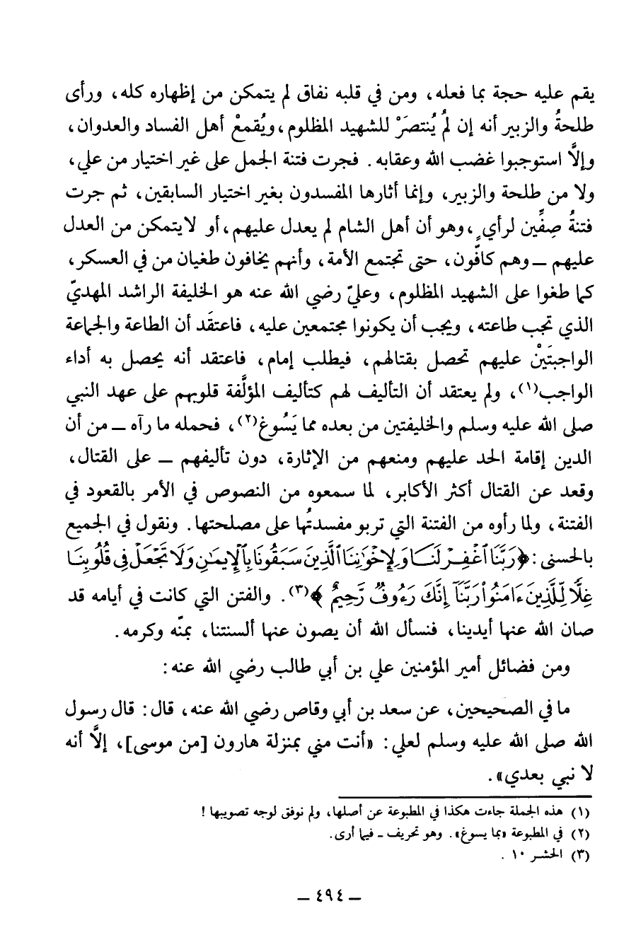تَقُمْ عَلَيْهِ حُجَّةٌ بِمَا فَعَلَهُ، وَمَنْ فِي قَلْبِهِ نِفَاقٌ لَمْ يَتَمَكَّنْ مِنْ إِظْهَارِهِ كُلِّهِ، وَرَأَى طَلْحَةُ وَالزُّبَيْرُ أَنَّهُ إِنْ لَمْ يُنْتَصَرْ لِلشَّهِيدِ الْمَظْلُومِ، وَيُقْمَعْ أَهْلُ الْفَسَادِ وَالْعُدْوَانِ، وَإِلَّا اسْتَوْجَبُوا غَضَبَ اللَّهِ وَعِقَابَهُ. فَجَرَتْ فِتْنَةُ الْجَمَلِ عَلَى غَيْرِ اخْتِيَارٍ مِنْ عَلِيٍّ، وَلَا مِنْ طَلْحَةَ وَالزُّبَيْرِ، وَإِنَّمَا أَثَارَهَا الْمُفْسِدُونَ بِغَيْرِ اخْتِيَارِ السَّابِقِينَ، ثُمَّ جَرَتْ فِتْنَةُ صِفِّينَ لِرَأْيٍ، وَهُوَ أَنَّ أَهْلَ الشَّامِ لَمْ يُعْدَلْ عَلَيْهِمْ، أَوْ لَا يُتَمَكَّنْ مِنَ الْعَدْلِ عَلَيْهِمْ - وَهُمْ كَافُّونَ، حَتَّى تَجْتَمِعَ الْأُمَّةُ، وَأَنَّهُمْ يَخَافُونَ طُغْيَانَ مَنْ فِي الْعَسْكَرِ، كَمَا طَغَوْا عَلَى الشَّهِيدِ الْمَظْلُومِ، وَعَلِيٌّ رَضِيَ اللَّهُ عَنْهُ هُوَ الْخَلِيفَةُ الرَّاشِدُ الْمَهْدِيُّ الَّذِي تَجِبُ طَاعَتُهُ، وَيَجِبُ أَنْ يَكُونَوا مُجْتَمِعِينَ عَلَيْهِ، فاعْتَقَدَ أَنَّ الطَّاعَةَ وَالْجَمَاعَةَ الْوَاجِبَتَيْنِ عَلَيْهِمْ تَحْصُلُ بِقِتَالِهِمْ، فَيُطْلَبُ إِمَامٌ، فَاعْتَقَدَ أَنَّهُ يَحْصُلُ بِهِ أَدَاءُ الْوَاجِبِ (¬1)، وَلَمْ يَعْتَقِدْ أَنَّ التَّأْلِيفَ لَهُمْ كَتَأْلِيفِ الْمُؤَلَّفَةِ قُلُوبُهُمْ عَلَى عَهْدِ النَّبِيِّ صَلَّى اللَّهُ عَلَيْهِ وَسَلَّمَ وَالْخَلِيفَتَيْنِ مِنْ بَعْدِهِ مِمَّا يَسُوغُ (¬2)، فَحَمَلَهُ مَا رَآهُ - مِنْ أَنَّ الدِّينَ إِقَامَةُ الْحَدِّ عَلَيْهِمْ وَمَنْعُهُمْ مِنَ الْإِثَارَةِ، دُونَ تَأْلِيفِهِمْ -: عَلَى الْقِتَالِ، وَقَعَدَ عَنِ الْقِتَالِ أَكْثَرُ الْأَكَابِرِ، لِمَا سَمِعُوهُ مِنَ النُّصُوصِ فِي الْأَمْرِ بِالْقُعُودِ فِي الْفِتْنَةِ، وَلِمَا رَأَوْهُ مِنَ الْفِتْنَةِ الَّتِي تَرْبُو مَفْسَدَتُهَا عَلَى مَصْلَحَتِهَا. وَنَقُولُ فِي الْجَمِيعِ بِالْحُسْنَى: {رَبَّنَا اغْفِرْ لَنَا وَلِإِخْوَانِنَا الَّذِينَ سَبَقُونَا بِالْإِيمَانِ وَلَا تَجْعَلْ فِي قُلُوبِنَا غِلًّا لِلَّذِينَ آمَنُوا رَبَّنَا إِنَّكَ رَءُوفٌ رَحِيمٌ} (¬3).