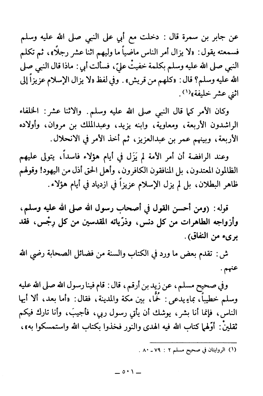 عَنْ جَابِرِ بْنِ سَمُرَةَ، قَالَ: «دَخَلْتُ مَعَ أَبِي عَلَى النَّبِيِّ صَلَّى اللَّهُ عَلَيْهِ وَسَلَّمَ، فَسَمِعْتُهُ يَقُولُ: لَا يَزَالُ أَمْرُ النَّاسِ مَاضِيًا مَا وَلِيَهُمُ اثْنَا عَشَرَ رَجُلًا، ثُمَّ تَكَلَّمَ النَّبِيُّ صَلَّى اللَّهُ عَلَيْهِ وَسَلَّمَ بِكَلِمَةٍ خَفِيَتْ عَلَيَّ، فَسَأَلْتُ أَبِي: مَاذَا قَالَ النَّبِيُّ صَلَّى اللَّهُ عَلَيْهِ وَسَلَّمَ؟ قَالَ: " كُلُّهُمْ مِنْ قُرَيْشٍ». وَفِي لَفْظٍ: «لَا يَزَالُ الْإِسْلَامُ عَزِيزًا إِلَى اثْنَيْ عَشَرَ خَلِيفَةً» (¬1).
