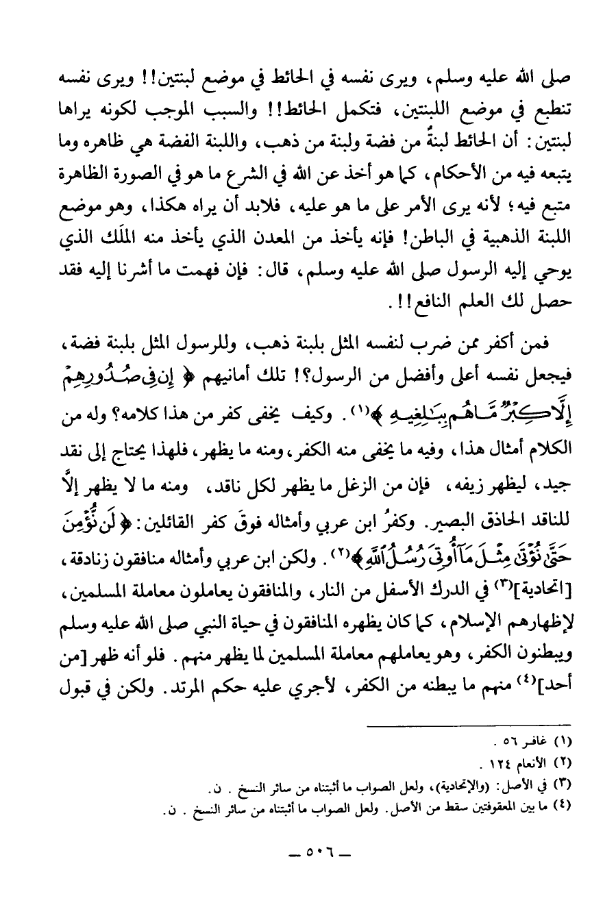 فَمَنْ أَكْفَرُ مِمَّنْ ضَرَبَ لِنَفْسِهِ الْمَثَلَ بِلَبِنَةِ ذَهَبٍ، وَلِلرُّسُلِ الْمَثَلَ بِلَبِنَةِ فِضَّةٍ، فَيَجْعَلُ نَفْسَهُ أَعْلَى وَأَفْضَلَ مِنَ الرَّسُولِ؟! تِلْكَ أَمَانِيُّهُمْ: {إِنْ فِي صُدُورِهِمْ إِلَّا كِبْرٌ مَا هُمْ بِبَالِغِيهِ} (¬1). وَكَيْفَ يَخْفَى كُفْرُ مَنْ هَذَا كَلَامُهُ؟ وَلَهُ مِنَ الْكَلَامِ أَمْثَالُ هَذَا، وَفِيهِ مَا يَخْفَى مِنْهُ الْكُفْرُ، وَمِنْهُ مَا يَظْهَرُ، فَلِهَذَا يَحْتَاجُ إِلَى نَاقِدٍ جَيِّدٍ، لِيُظْهِرَ زَيْفَهُ، فَإِنَّ مِنَ الزَّغَلِ مَا يَظْهَرُ لِكُلِّ نَاقِدٍ، وَمِنْهُ مَا لَا يَظْهَرُ إِلَّا لِلنَّاقِدِ الْحَاذِقِ الْبَصِيرِ. وَكُفْرُ ابْنُ عَرَبِيٍّ وَأَمْثَالِهِ فَوْقَ كُفْرِ الْقَائِلِينَ: {لَنْ نُؤْمِنَ حَتَّى نُؤْتَى مِثْلَ مَا أُوتِيَ رُسُلُ اللَّهِ} (¬2). وَلَكِنَّ ابْنَ عَرَبِيٍّ وَأَمْثَالَهُ مُنَافِقُونَ زَنَادِقَةٌ، [اتِّحَادِيَّةٌ] (¬3) فِي الدَّرْكِ الْأَسْفَلِ مِنَ النَّارِ، وَالْمُنَافِقُونَ يُعَامَلُونَ مُعَامَلَةَ الْمُسْلِمِينَ، لِإِظْهَارِهِمُ الْإِسْلَامَ، كَمَا كَانَ يُظْهِرُهُ الْمُنَافِقُونَ فِي حَيَاةِ النَّبِيِّ صَلَّى اللَّهُ عَلَيْهِ وَسَلَّمَ وَيُبْطِنُونَ الْكُفْرَ، وَهُوَ يُعَامِلُهُمْ مُعَامَلَةَ الْمُسْلِمِينَ لِمَا يَظْهَرُ مِنْهُمْ. فَلَوْ أَنَّهُ ظَهَرَ [مِنْ أَحَدٍ] (¬4) مِنْهُمْ مَا يُبْطِنُهُ مِنَ الْكُفْرِ، لَأَجْرَى عَلَيْهِ حُكْمَ الْمُرْتَدِّ. وَلَكِنْ فِي قَبُولِ