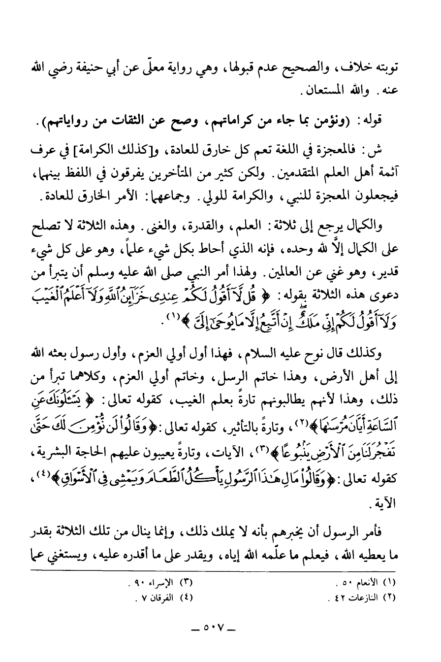 قَوْلُهُ: (وَنُؤْمِنُ بِمَا جَاءَ مِنْ كَرَامَاتِهِمْ، وَصَحَّ عَنِ الثِّقَاتِ مِنْ رِوَايَاتِهِمْ).