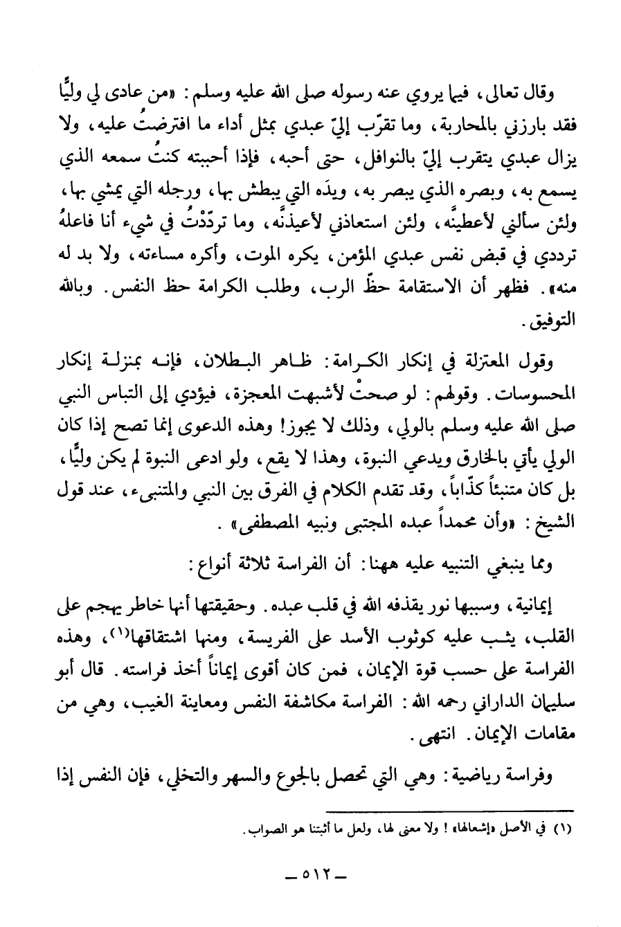 وَقَالَ تَعَالَى، فِيمَا يَرْوِي عَنْهُ رَسُولُهُ صَلَّى اللَّهُ عَلَيْهِ وَسَلَّمَ: «مَنْ عَادَى لِي وَلِيًّا فَقَدْ بَارَزَنِي بِالْمُحَارَبَةِ، وَمَا تَقَرَّبَ إِلَيَّ عَبْدِي بِمِثْلِ أَدَاءِ مَا افْتَرَضْتُ عَلَيْهِ، وَلَا يَزَالُ عَبْدِي يَتَقَرَّبُ إِلَيَّ بِالنَّوَافِلِ حَتَّى أُحِبَّهُ، فَإِذَا أَحْبَبْتُهُ كُنْتُ سَمْعَهُ الَّذِي يَسْمَعُ بِهِ، وَبَصَرَهُ الَّذِي يُبْصِرُ بِهِ، وَيَدَهُ الَّتِي يَبْطِشُ بِهَا، وَرِجْلَهُ الَّتِي يَمْشِي بِهَا، وَلَئِنْ سَأَلَنِي لَأُعْطِيَنَّهُ، وَلَئِنِ اسْتَعَاذَنِي لِأُعِيذَنَّهُ، وَمَا تَرَدَّدْتُ فِي شَيْءٍ أَنَا فَاعِلُهُ تَرَدُّدِي فِي قَبْضِ نَفْسِ عَبْدِي الْمُؤْمِنِ، يَكْرَهُ الْمَوْتَ، وَأَكْرَهُ مَسَاءَتَهُ، وَلَا بُدَّ لَهُ مِنْهُ». فَظَهَرَ أَنَّ الِاسْتِقَامَةَ حَظُّ الرَّبِّ، وَطَلَبَ الْكَرَامَةِ حَظُّ النَّفْسِ. وَبِاللَّهِ التَّوْفِيقُ.