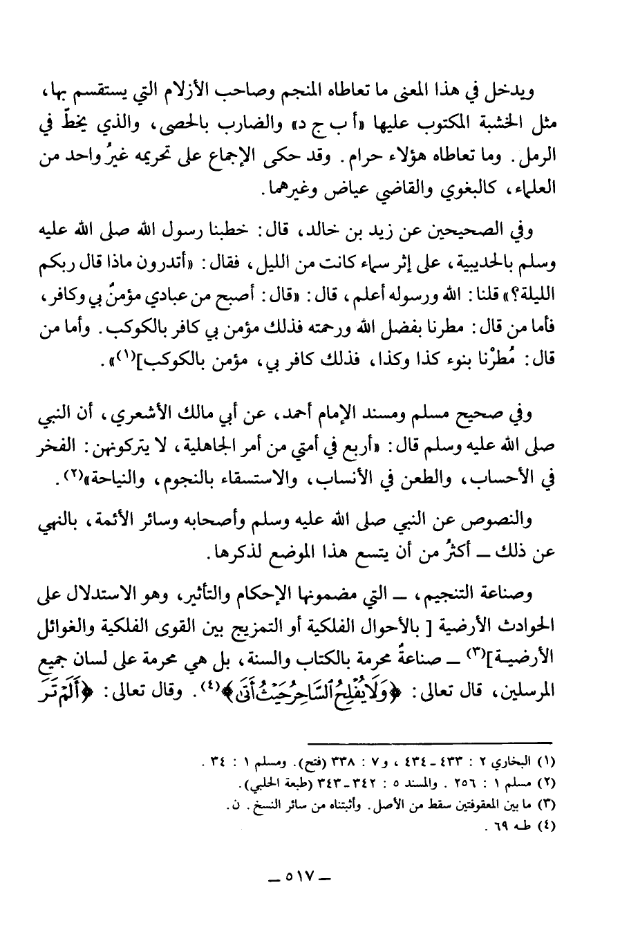 وَصِنَاعَةُ التَّنْجِيمِ، الَّتِي مَضْمُونُهَا الْإِحْكَامُ وَالتَّأْثِيرُ، وَهُوَ الِاسْتِدْلَالُ عَلَى الْحَوَادِثِ الْأَرْضِيَّةِ [بِالْأَحْوَالِ الْفَلَكِيَّةِ أَوِ التَّمْزِيجِ بَيْنَ الْقُوَى الْفَلَكِيَّةِ وَالْغَوَائِلِ الْأَرْضِيَّةِ] (¬3) -: صِنَاعَةٌ مُحَرَّمَةٌ بِالْكِتَابِ وَالسُّنَّةِ، بَلْ هِيَ مُحَرَّمَةٌ عَلَى لِسَانِ جَمِيعِ الْمُرْسَلِينَ، قَالَ تَعَالَى: {وَلَا يُفْلِحُ السَّاحِرُ حَيْثُ أَتَى} (¬4). وَقَالَ تَعَالَى: {أَلَمْ تَرَ}