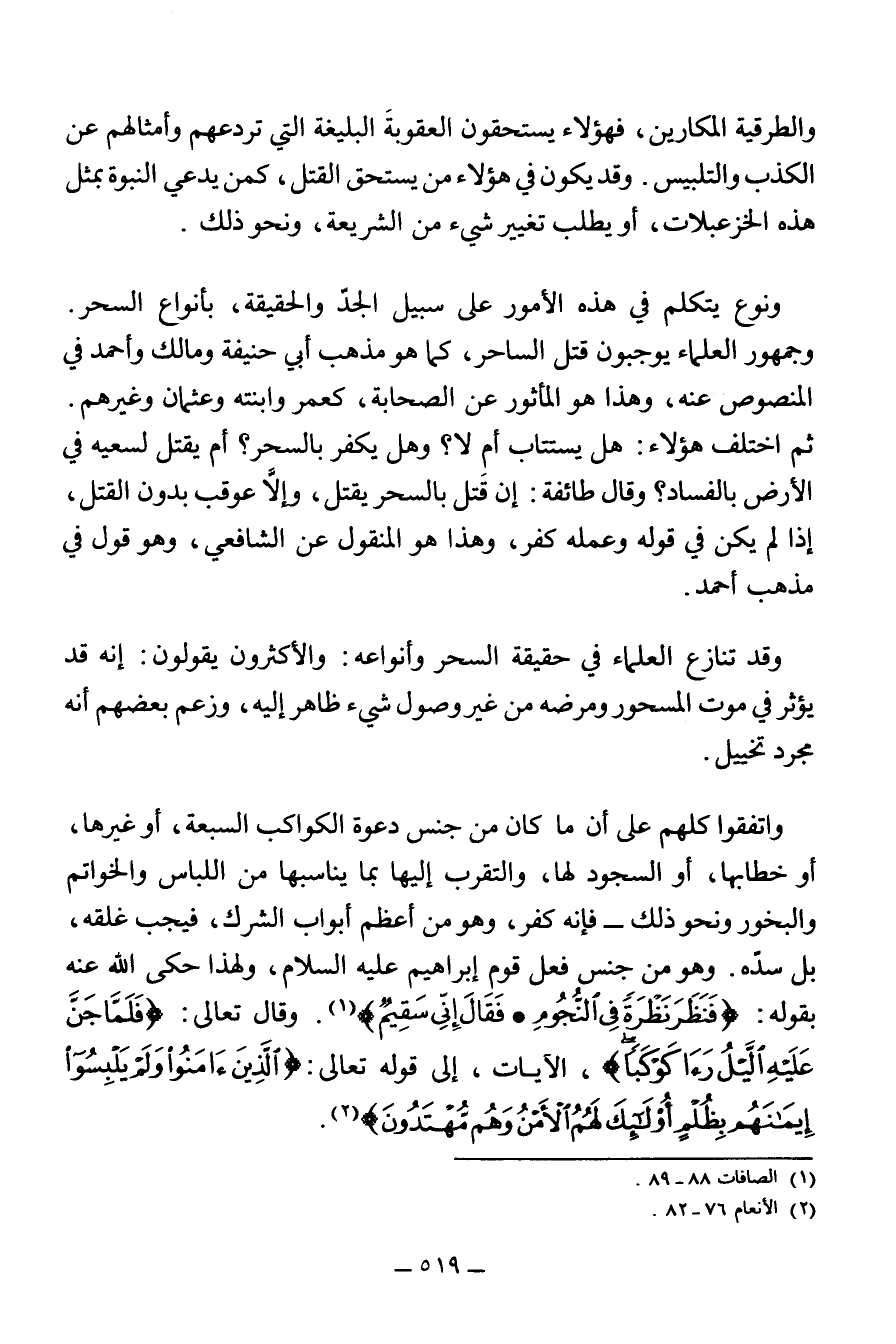 وَنَوْعٌ يَتَكَلَّمُ فِي هَذِهِ الْأُمُورِ عَلَى سَبِيلِ الْجِدِّ وَالْحَقِيقَةِ، بِأَنْوَاعِ السِّحْرِ. وَجُمْهُورُ الْعُلَمَاءِ يُوجِبُونَ قَتْلَ السَّاحِرِ، كَمَا هُوَ مَذْهَبُ أَبِي حَنِيفَةَ وَمَالِكٍ وَأَحْمَدَ فِي الْمَنْصُوصِ عَنْهُ، وَهَذَا هُوَ الْمَأْثُورُ عَنِ الصَّحَابَةِ، كَعُمَرَ وَابْنِهِ وَعُثْمَانَ وَغَيْرِهِمْ. ثُمَّ اخْتَلَفَ هَؤُلَاءِ: هَلْ يُسْتَتَابُ أَمْ لَا؟ وَهَلْ يُكَفَّرُ بِالسِّحْرِ؟ أَمْ يُقْتَلُ لِسَعْيِهِ فِي الْأَرْضِ بِالْفَسَادِ؟ وَقَالَ طَائِفَةٌ: إِنْ قَتَلَ بِالسِّحْرِ قُتِلَ، وَإِلَّا عُوقِبَ بِدُونِ الْقَتْلِ، إِذَا لَمْ يَكُنْ فِي قَوْلِهِ وَعَمَلِهِ كُفْرٌ، وَهَذَا هُوَ الْمَنْقُولُ عَنِ الشَّافِعِيِّ، وَهُوَ قَوْلٌ فِي مَذْهَبِ أَحْمَدَ رَحِمَهُمَا اللَّهُ.