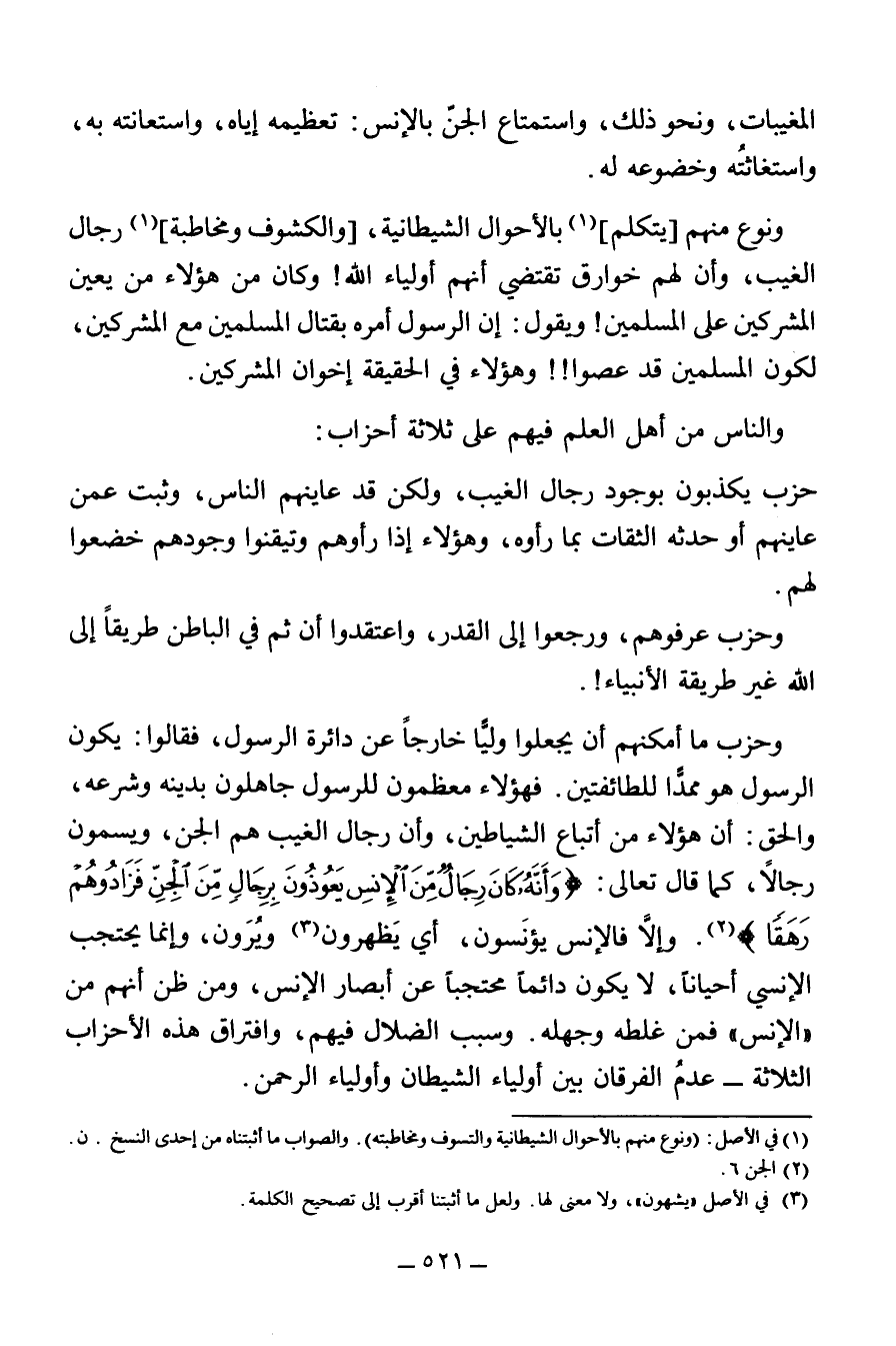 وَالْحَقُّ: أَنَّ هَؤُلَاءِ مِنْ أَتْبَاعِ الشَّيَاطِينِ، وَأَنَّ رِجَالَ الْغَيْبِ هُمُ الْجِنُّ، وَيُسَمَّوْنَ رِجَالًا، كَمَا قَالَ تَعَالَى: {وَأَنَّهُ كَانَ رِجَالٌ مِنَ الْإِنْسِ يَعُوذُونَ بِرِجَالٍ مِنَ الْجِنِّ فَزَادُوهُمْ رَهَقًا} (¬3). وَإِلَّا فَالْإِنْسُ يُؤْنَسُونَ، أَيْ يظهرون (¬4) وَيُرَوْنَ، وَإِنَّمَا يَحْتَجِبُ الْإِنْسِيُّ أَحْيَانًا، لَا يَكُونُ دَائِمًا مُحْتَجِبًا عَنْ أَبْصَارِ الْإِنْسِ، وَمَنْ ظَنَّ أَنَّهُمْ مِنَ " الْإِنْسِ " فَمِنْ غَلَطِهِ وَجَهْلِهِ. وَسَبَبُ الضَّلَالِ فِيهِمْ، وَافْتِرَاقِ هَذِهِ الْأَحْزَابِ الثَّلَاثَةِ - عَدَمُ الْفُرْقَانِ بَيْنَ أَوْلِيَاءِ الشَّيْطَانِ وَأَوْلِيَاءِ الرَّحْمَنِ.
