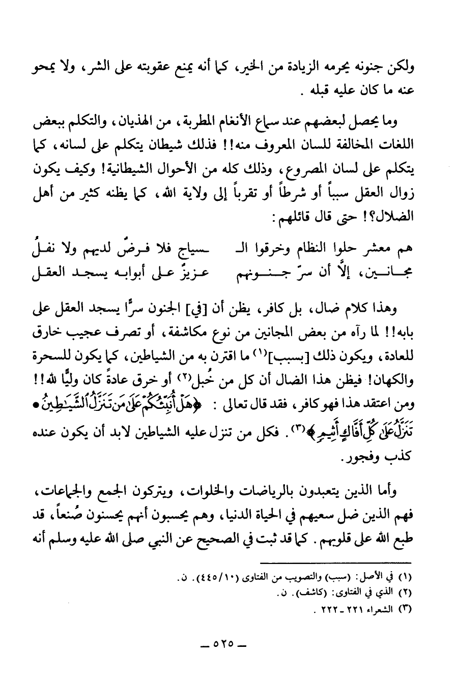 وَهَذَا كَلَامُ ضَالٍّ، بَلْ كَافِرٍ، يَظُنُّ أَنَّ [فِي] الْجُنُونِ سِرًّا يَسْجُدُ الْعَقْلُ عَلَى بَابِهِ!! لِمَا رَآهُ مِنْ بَعْضِ الْمَجَانِينِ مِنْ نَوْعِ مُكَاشَفَةٍ، أَوْ تَصَرُّفٍ عَجِيبٍ خَارِقٍ لِلْعَادَةِ، وَيَكُونُ ذَلِكَ [بِسَبَبِ] (¬1) مَا اقْتَرَنَ بِهِ مِنَ الشَّيَاطِينِ، كَمَا يَكُونُ لِلسَّحَرَةِ وَالْكُهَّانِ! فَيَظُنُّ هَذَا الضَّالُّ أَنَّ كُلَّ مَنْ خُبِلَ (¬2) أَوْ خَرَقَ عَادَةً كَانَ وَلِيًّا لِلَّهِ!! وَمَنِ اعْتَقَدَ هَذَا فَهُوَ كَافِرٌ، فَقَدْ قَالَ تَعَالَى: {هَلْ أُنَبِّئُكُمْ عَلَى مَنْ تَنَزَّلُ الشَّيَاطِينُ} {تَنَزَّلُ عَلَى كُلِّ أَفَّاكٍ أَثِيمٍ} (¬3). فَكُلُّ مَنْ تَنْزِلُ عَلَيْهِ الشَّيَاطِينُ لَا بُدَّ أَنْ يَكُونَ عِنْدَهُ كَذِبٌ وَفُجُورٌ.