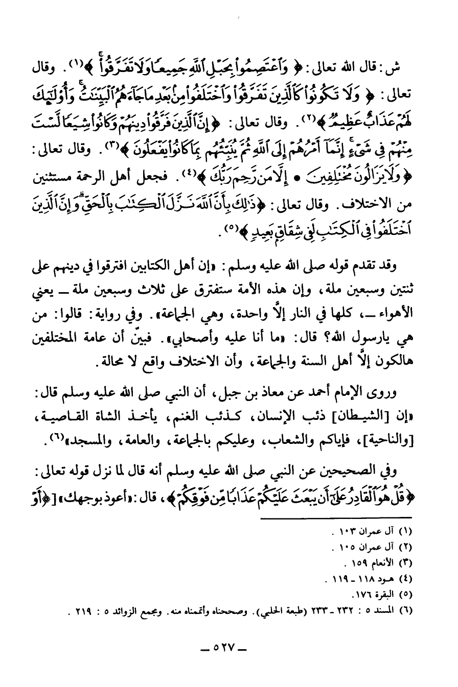 ش: قَالَ اللَّهُ تَعَالَى: {وَاعْتَصِمُوا بِحَبْلِ اللَّهِ جَمِيعًا وَلَا تَفَرَّقُوا} (¬1). وَقَالَ تَعَالَى: {وَلَا تَكُونُوا كَالَّذِينَ تَفَرَّقُوا وَاخْتَلَفُوا مِنْ بَعْدِ مَا جَاءَهُمُ الْبَيِّنَاتُ وَأُولَئِكَ لَهُمْ عَذَابٌ عَظِيمٌ} (¬2). وَقَالَ تَعَالَى: {إِنَّ الَّذِينَ فَرَّقُوا دِينَهُمْ وَكَانُوا شِيَعًا لَسْتَ مِنْهُمْ فِي شَيْءٍ إِنَّمَا أَمْرُهُمْ إِلَى اللَّهِ ثُمَّ يُنَبِّئُهُمْ بِمَا كَانُوا يَفْعَلُونَ} (¬3). وَقَالَ تَعَالَى: {وَلَا يَزَالُونَ مُخْتَلِفِينَ} {إِلَّا مَنْ رَحِمَ رَبُّكَ} (¬4). فَجَعَلَ أَهْلَ الرَّحْمَةِ مُسْتَثْنَيْنَ مِنْ الِاخْتِلَافِ. وَقَالَ تَعَالَى: {ذَلِكَ بِأَنَّ اللَّهَ نَزَّلَ الْكِتَابَ بِالْحَقِّ وَإِنَّ الَّذِينَ اخْتَلَفُوا فِي الْكِتَابِ لَفِي شِقَاقٍ بَعِيدٍ} (¬5).