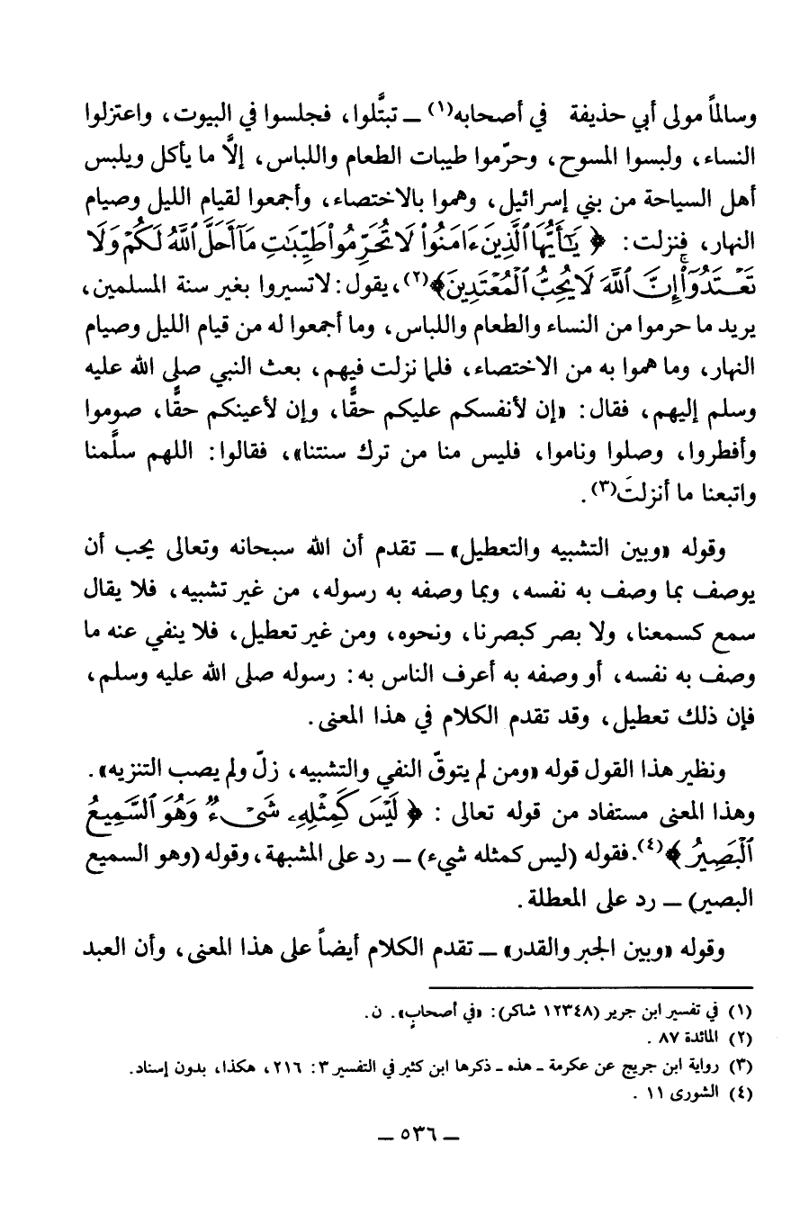 وَنَظِيرُ هَذَا الْقَوْلِ قَوْلُهُ: " وَمَنْ لَمْ يَتَوَقَّ النَّفْيَ وَالتَّشْبِيهَ، زَلَّ وَلَمْ يُصِبِ التَّنْزِيهَ ". وَهَذَا الْمَعْنَى مُسْتَفَادٌ مِنْ قَوْلِهِ تَعَالَى: {لَيْسَ كَمِثْلِهِ شَيْءٌ وَهُوَ السَّمِيعُ الْبَصِيرُ} (¬4). فَقَوْلُهُ: {لَيْسَ كَمِثْلِهِ شَيْءٌ} - رَدٌّ عَلَى الْمُشَبِّهَةِ، وَقَوْلُهُ: {وَهُوَ السَّمِيعُ الْبَصِيرُ} - رَدٌّ عَلَى الْمُعَطِّلَةِ.
