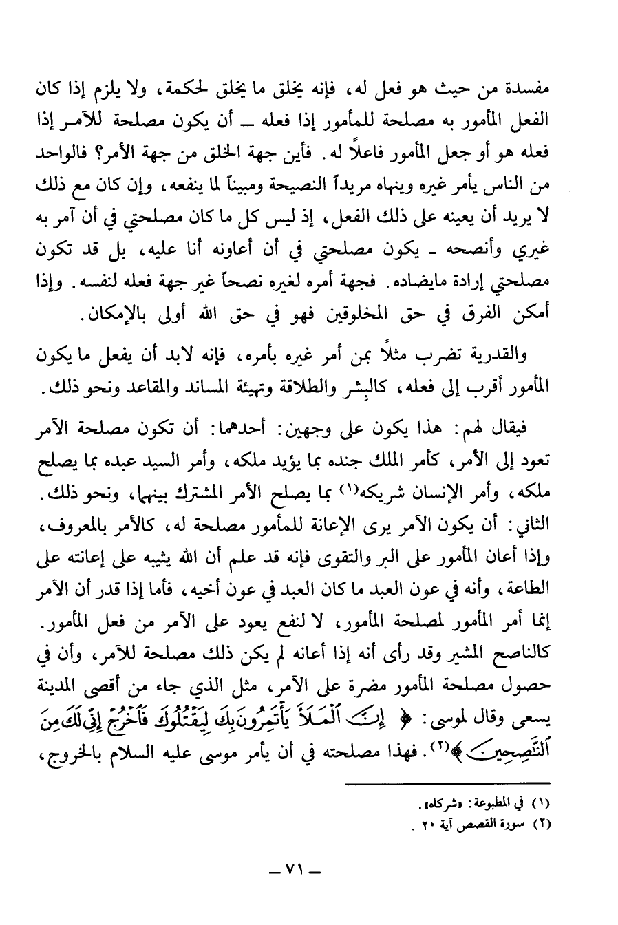 مَفْسَدَةٍ مِنْ حَيْثُ هُوَ فِعْلٌ لَهُ، فَإِنَّهُ يَخْلُقُ مَا يَخْلُقُ لِحِكْمَةٍ، وَلَا يَلْزَمُ إِذَا كَانَ الْفِعْلُ الْمَأْمُورُ بِهِ مَصْلَحَةً لِلْمَأْمُورِ إِذَا فَعَلَهُ - أَنْ يَكُونَ مَصْلَحَةً لِلْآمِرِ إِذَا فَعَلَهُ هُوَ أَوْ جَعَلَ الْمَأْمُورَ فَاعِلًا لَهُ. فَأَيْنَ جِهَةُ الْخَلْقِ مِنْ جِهَةِ الْأَمْرِ؟ فَالْوَاحِدُ مِنَ النَّاسِ يَأْمُرُ غَيْرَهُ وَيَنْهَاهُ مُرِيدًا النَّصِيحَةَ وَمُبَيِّنًا لِمَا يَنْفَعُهُ، وَإِنْ كَانَ مَعَ ذَلِكَ لَا يُرِيدُ أَنْ يُعِينَهُ عَلَى ذَلِكَ الْفِعْلِ، إِذْ لَيْسَ كُلُّ مَا كَانَ مَصْلَحَتِي فِي أَنْ آمُرَ بِهِ غَيْرِي وَأَنْصَحَهُ - يَكُونُ مَصْلَحَتِي فِي أَنْ أُعَاوِنَهُ أَنَا عَلَيْهِ، بَلْ قَدْ تَكُونُ مَصْلَحَتِي إِرَادَةَ مَا يُضَادُّهُ. فَجِهَةُ أَمْرِهِ لِغَيْرِهِ نُصْحًا غَيْرُ جِهَةِ فِعْلِهِ لِنَفْسِهِ، وَإِذَا أَمْكَنَ الْفَرْقُ فِي حَقِّ الْمَخْلُوقِينَ فَهُوَ فِي حَقِّ اللَّهِ أَوْلَى بِالْإِمْكَانِ.