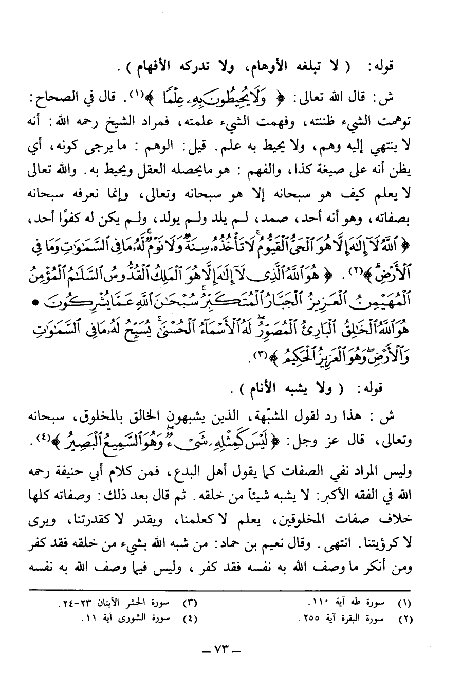 ش: قَالَ اللَّهُ تَعَالَى: {وَلَا يُحِيطُونَ بِهِ عِلْمًا} (¬1). قَالَ فِي الصِّحَاحِ: تَوَهَّمْتُ الشَّيْءَ: ظَنَنْتُهُ، وَفَهِمْتُ الشَّيْءَ: عَلِمْتُهُ. فَمُرَادُ الشَّيْخِ رَحِمَهُ اللَّهُ: أَنَّهُ لَا يَنْتَهِي إِلَيْهِ وَهْمٌ، وَلَا يُحِيطُ بِهِ عِلْمٌ. قِيلَ: الْوَهْمُ مَا يُرْجَى كَوْنُهُ، أَيْ: يُظَنُّ أَنَّهُ عَلَى صيغةِ كَذَا، وَالْفَهْمُ: هُوَ مَا يُحَصِّلُهُ الْعَقْلُ وَيُحِيطُ بِهِ. وَاللَّهُ - تَعَالَى - لَا يَعْلَمُ كَيْفَ هُوَ سُبْحَانَهُ إِلَّا هُوَ سُبْحَانَهُ وَتَعَالَى، وَإِنَّمَا نَعْرِفُهُ سُبْحَانَهُ بِصِفَاتِهِ، وَهُوَ أَنَّهُ أَحَدٌ، صَمَدٌ، لَمْ يَلِدْ وَلَمْ يُولَدْ، وَلَمْ يَكُنْ لَهُ كُفُوًا أَحَدٌ، {اللَّهُ لَا إِلَهَ إِلَّا هُوَ الْحَيُّ الْقَيُّومُ لَا تَأْخُذُهُ سِنَةٌ وَلَا نَوْمٌ لَهُ مَا فِي السَّمَاوَاتِ وَمَا فِي الْأَرْضِ} (¬2). {هُوَ اللَّهُ الَّذِي لَا إِلَهَ إِلَّا هُوَ الْمَلِكُ الْقُدُّوسُ السَّلَامُ الْمُؤْمِنُ الْمُهَيْمِنُ الْعَزِيزُ الْجَبَّارُ الْمُتَكَبِّرُ سُبْحَانَ اللَّهِ عَمَّا يُشْرِكُونَ} {هُوَ اللَّهُ الْخَالِقُ الْبَارِئُ الْمُصَوِّرُ لَهُ الْأَسْمَاءُ الْحُسْنَى يُسَبِّحُ لَهُ مَا فِي السَّمَاوَاتِ وَالْأَرْضِ وَهُوَ الْعَزِيزُ الْحَكِيمُ} (¬3).