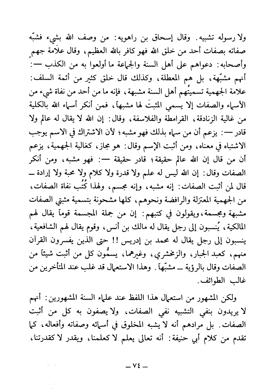 وَلَكِنَّ الْمَشْهُورَ مِنِ اسْتِعْمَالِ هَذَا اللَّفْظِ عِنْدَ عُلَمَاءِ السُّنَّةِ الْمَشْهُورِينَ: أَنَّهُمْ لَا يُرِيدُونَ بِنَفْيِ التَّشْبِيهِ نَفْيَ الصِّفَاتِ، وَلَا يَصِفُونَ بِهِ كُلَّ مَنْ أَثْبَتَ الصِّفَاتِ. بَلْ مُرَادُهُمْ أَنَّهُ لَا يُشْبِهُ الْمَخْلُوقَ فِي أَسْمَائِهِ وَصِفَاتِهِ وَأَفْعَالِهِ، كَمَا تَقَدَّمَ مِنْ كَلَامِ أَبِي حَنِيفَةَ: أَنَّهُ تَعَالَى يَعْلَمُ لَا كَعِلْمِنَا، وَيَقْدِرُ لَا كَقُدْرَتِنَا،