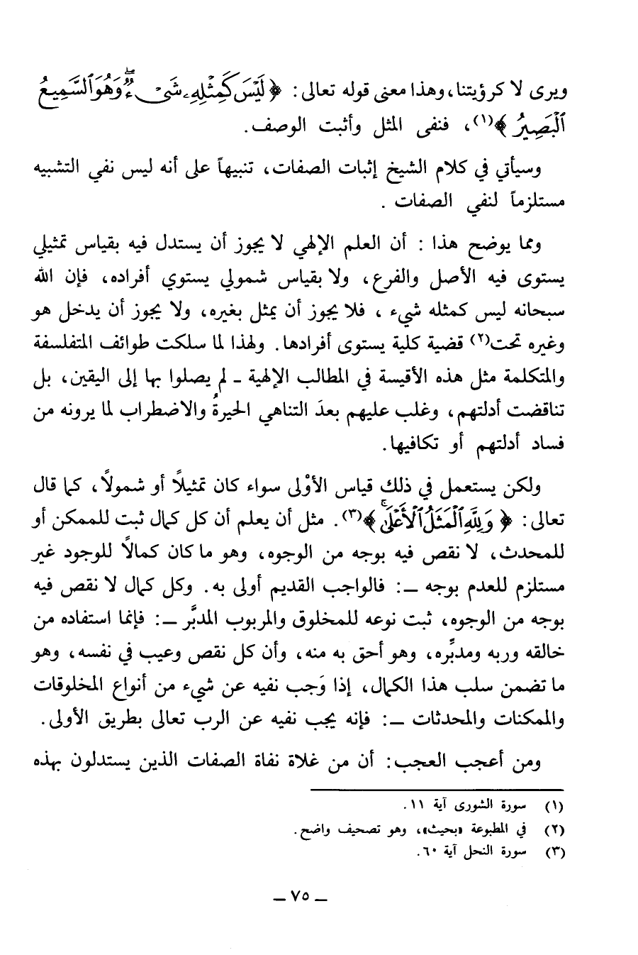 وَسَيَأْتِي فِي كَلَامِ الشَّيْخِ إِثْبَاتُ الصِّفَاتِ، تَنْبِيهًا عَلَى أَنَّهُ لَيْسَ نَفْيُ التَّشْبِيهِ مُسْتَلْزِمًا لِنَفْيِ الصِّفَاتِ.