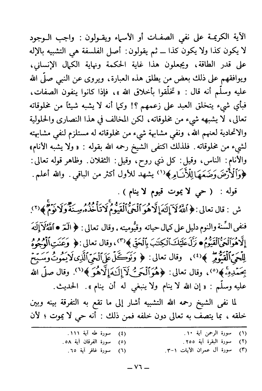 ش: قَالَ تَعَالَى: {اللَّهُ لَا إِلَهَ إِلَّا هُوَ الْحَيُّ الْقَيُّومُ لَا تَأْخُذُهُ سِنَةٌ وَلَا نَوْمٌ} (¬2). فَنَفْيُ السِّنَةِ وَالنَّوْمِ دَلِيلٌ عَلَى كَمَالِ حَيَاتِهِ وَقَيُّومِيَّتِهِ، وَقَالَ تَعَالَى: {الم} {اللَّهُ لَا إِلَهَ إِلَّا هُوَ الْحَيُّ الْقَيُّومُ} {نَزَّلَ عَلَيْكَ الْكِتَابَ بِالْحَقِّ} (¬3)، وَقَالَ تَعَالَى: {وَعَنَتِ الْوُجُوهُ لِلْحَيِّ الْقَيُّومِ} (¬4)، وَقَالَ تَعَالَى: {وَتَوَكَّلْ عَلَى الْحَيِّ الَّذِي لَا يَمُوتُ وَسَبِّحْ بِحَمْدِهِ} (¬5)، وَقَالَ تَعَالَى: {هُوَ الْحَيُّ لَا إِلَهَ إِلَّا هُوَ} (¬6). وَقَالَ - صَلَّى اللَّهُ عَلَيْهِ وَسَلَّمَ: «إِنَّ اللَّهَ لَا يَنَامُ وَلَا يَنْبَغِي لَهُ أَنْ يَنَامَ». الْحَدِيثَ.